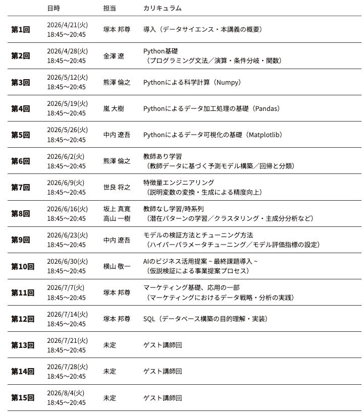 株式会社松尾研究所(本社:東京都文京区、代表取締役:川上登福)は、社会人を対象とした「GCI グローバル消費インテリジェンス講座 2026 Summer ~AI・データサイエンス実践~」を2026年4月より開講いたします。本講座は、松尾研究所が提供する社会人向けAI教育プログラム「Matsuo Lab AI Program」の一環として実施するものです。プログラミング経験のないビジネスパーソンでも、データの解析・分析スキルを基礎から体系的に習得できる全15回の実践型講座です。