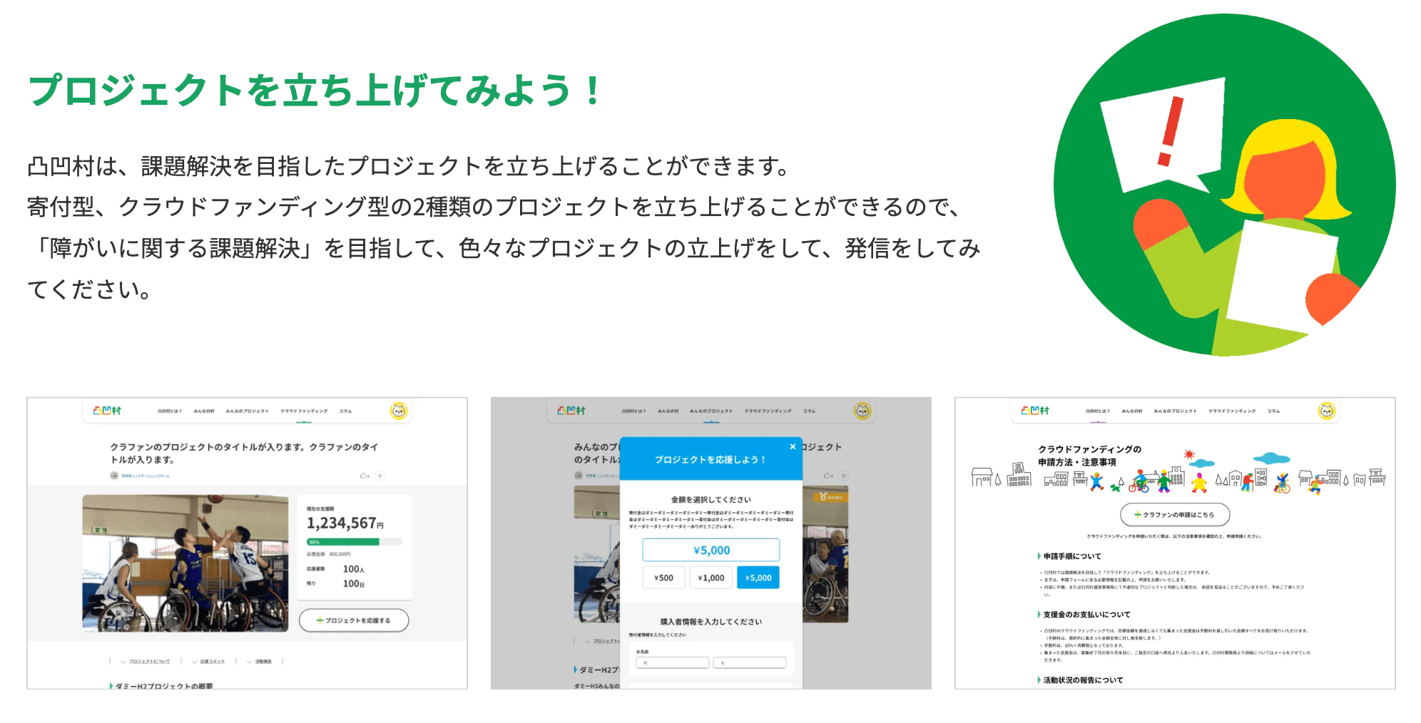 凸凹村は、障がい者限定のWEBコミュニティプラットフォームとなり、自身で「村」の立ち上げができ、障がいに対する課題解決に向けてプロジェクトの立ち上げや、クラウドファンディングの立ち上げをすることが可能です。クラウドファンディング手数料は5%と、どこよりも良心的な利率設定としており、障がい者の課題解決を応援してまいります。
