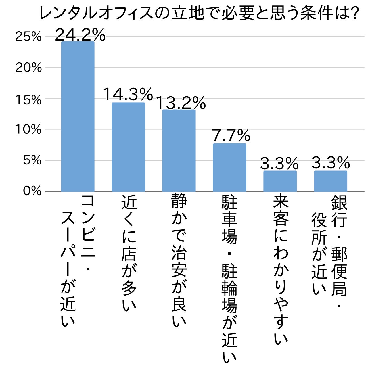 レンタルオフィスの立地は地域や駅からの近さのみならず、オフィス周辺地域の環境も非常に大切です。そこで、レンタルオフィスの立地で必要と思う条件についてアンケートで尋ねてみました。