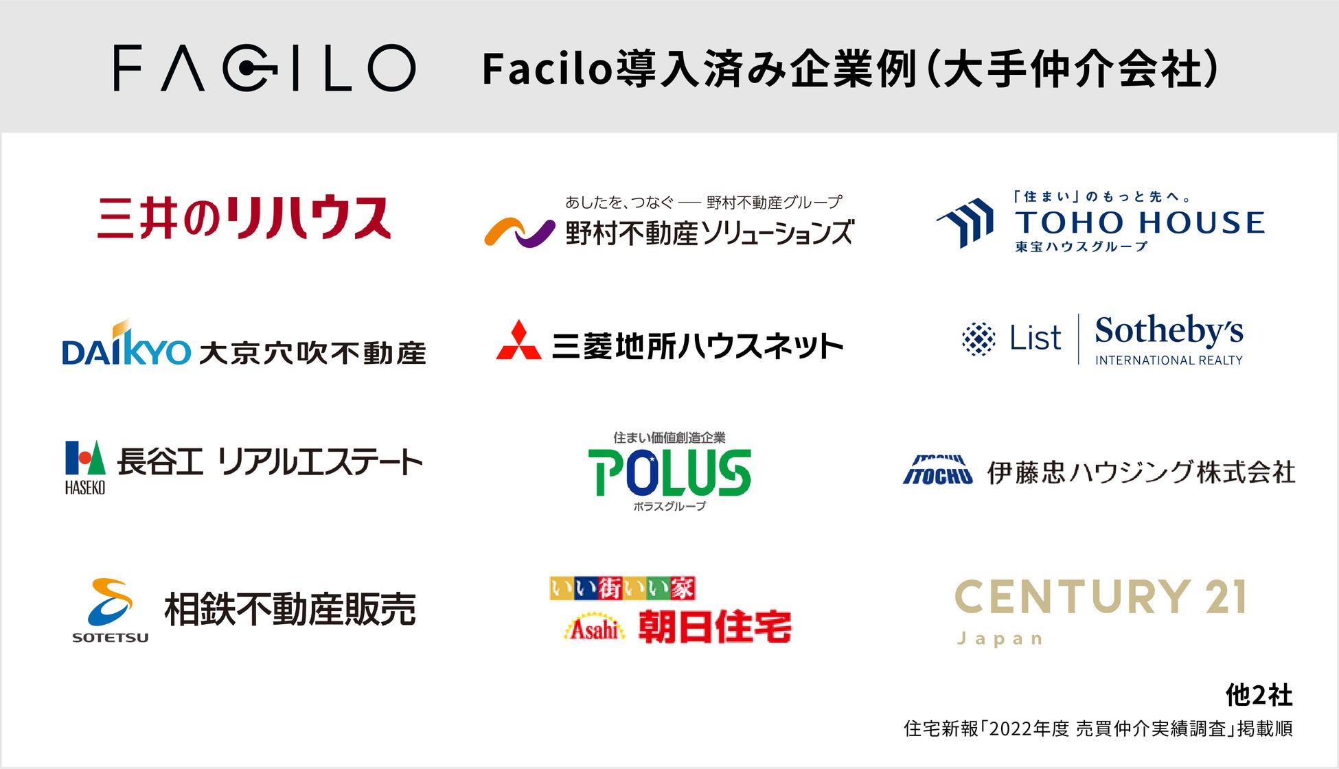 Facilo(ファシロ)は2023年2月に第一弾プロダクトとなる『Facilo物件購入クラウド』をリリースしました。買主と仲介営業との間の煩雑なやりとりを一元化・可視化する不動産コミュニケーションクラウドという新たなソリューションが大きな反響を呼び、売買仲介の大手30社のうち20社以上にすでに導入されるとともに、全国各地の地域密着型の企業にも導入が進んでいます。