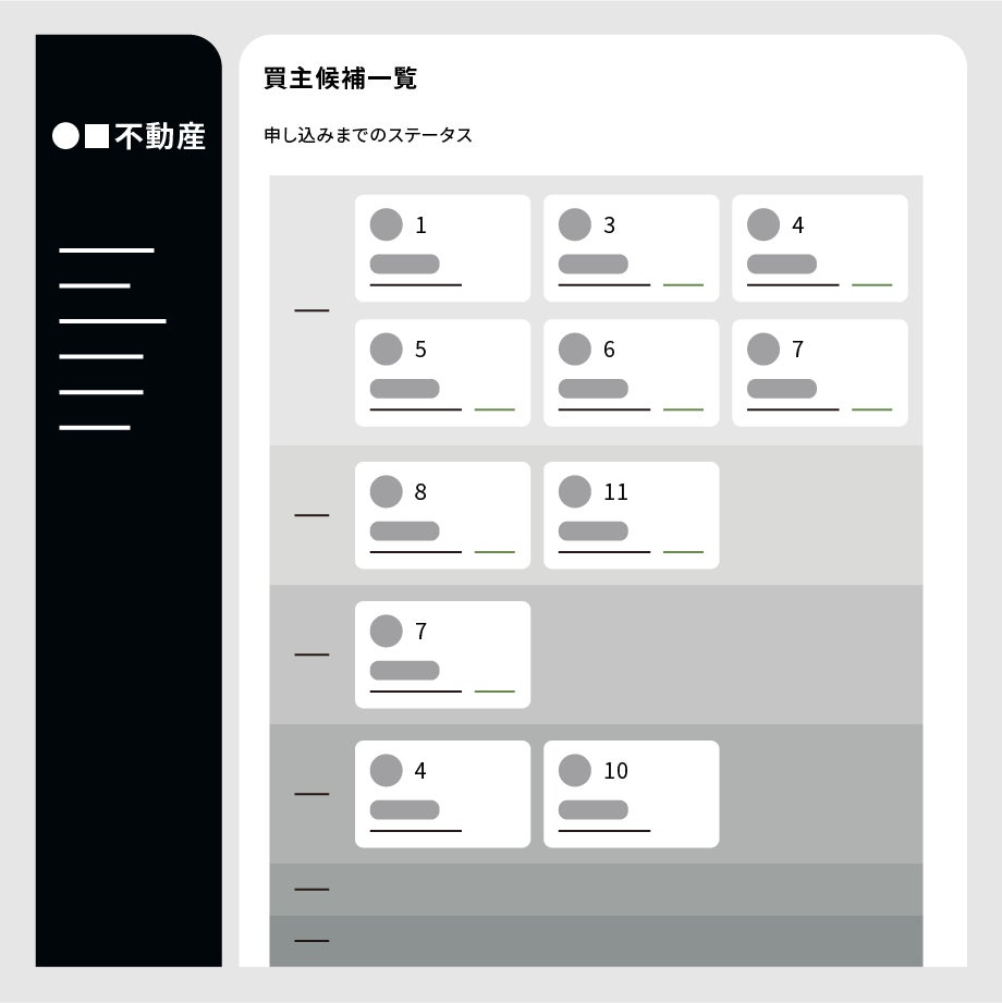 売り出し中の物件を検討している買主候補が、どのステータスにどれだけいるのかを一目で把握できます。クラウド上のログをもとにステータスが自動で更新されるため、面倒な手作業での更新業務を最小限に抑えることが可能です。