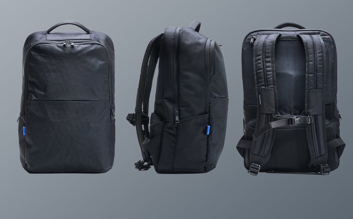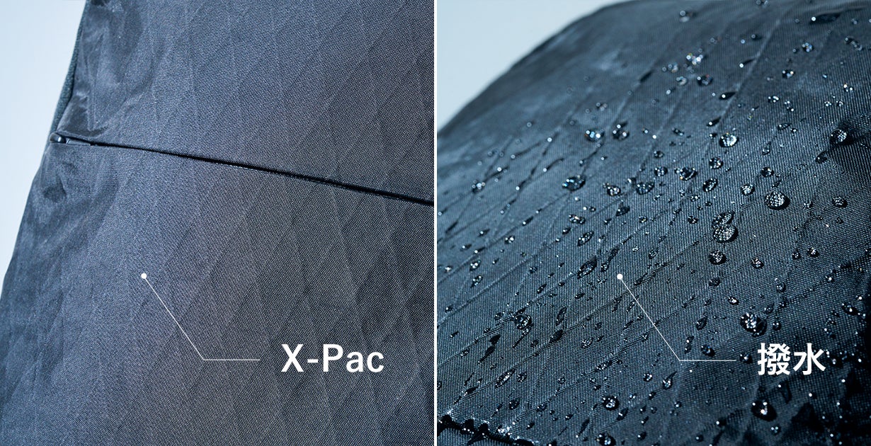 また、背面下部に取り付けたクッションがバックパックを腰で支え重量感を分散します。さらに、可動式のフロントストラップによりショルダーベルトのずれを防ぎ、荷重分散とフィット感が向上します。生地には水をはじき、軽さ・撥水性・耐久性を兼ね備えた素材「X-Pac」を使用しています。