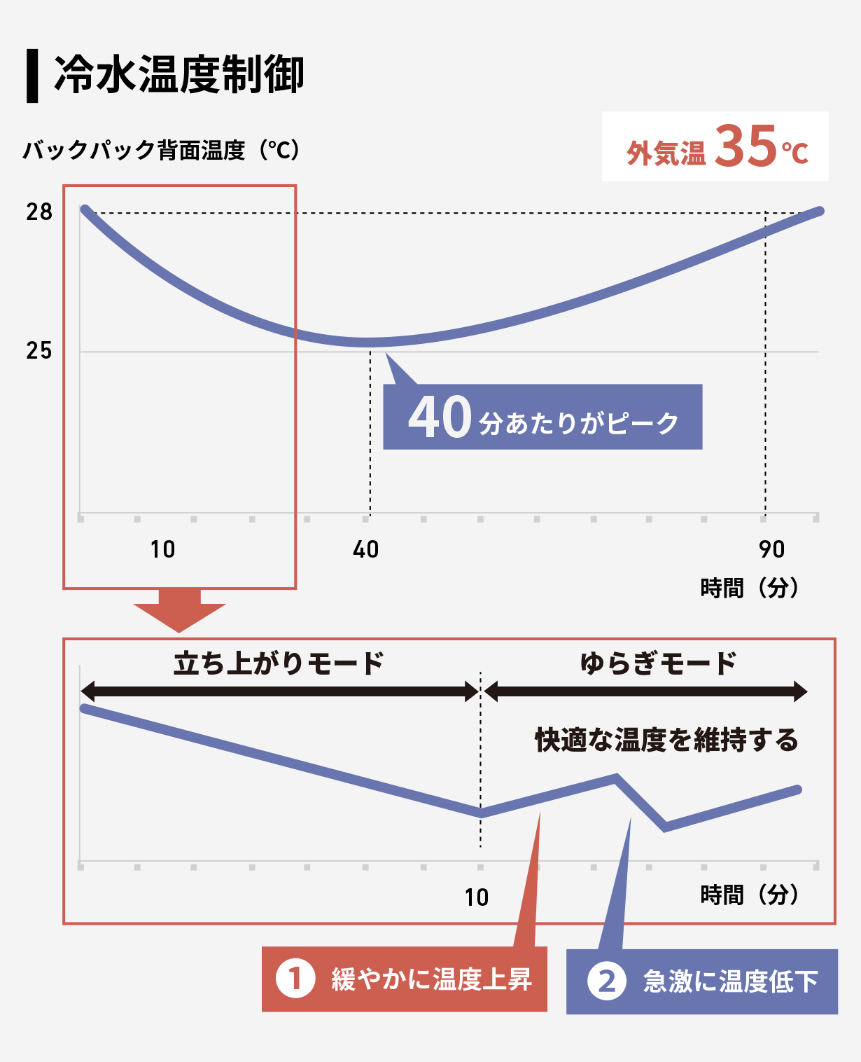 約2時間の稼働時間の中で、使用開始時は急激に温度を下げ、その後、温度を上下に変動させて“ゆらぎ”を持たせることで温度を感じやすくコントロールしています。当社の実験では、35℃の環境にバックパックを放置し2時間の連続運転を行ったとき、バックパック背面の温度が90分以上28℃以下に保たれることを確認※2しました。