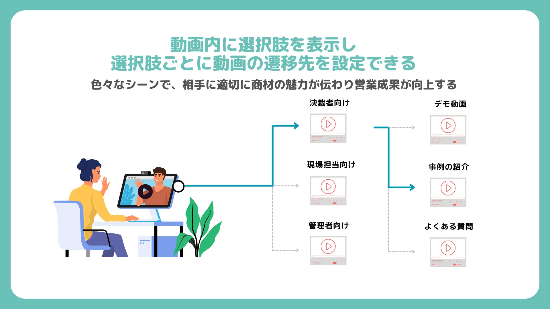 本特許は、対話型パーソナライズ動画で営業DXを実現することを目的とし、プレゼン動画内に選択肢を表示し選択肢ごとに動画の遷移先を設定したり、視聴者が入力フォーム(氏名やメールアドレスなどの情報)へ入力することで特定の別の動画に遷移させたりなど、視聴者の興味関心・立場によってパーソナライズ化された動画の視聴を可能にします。