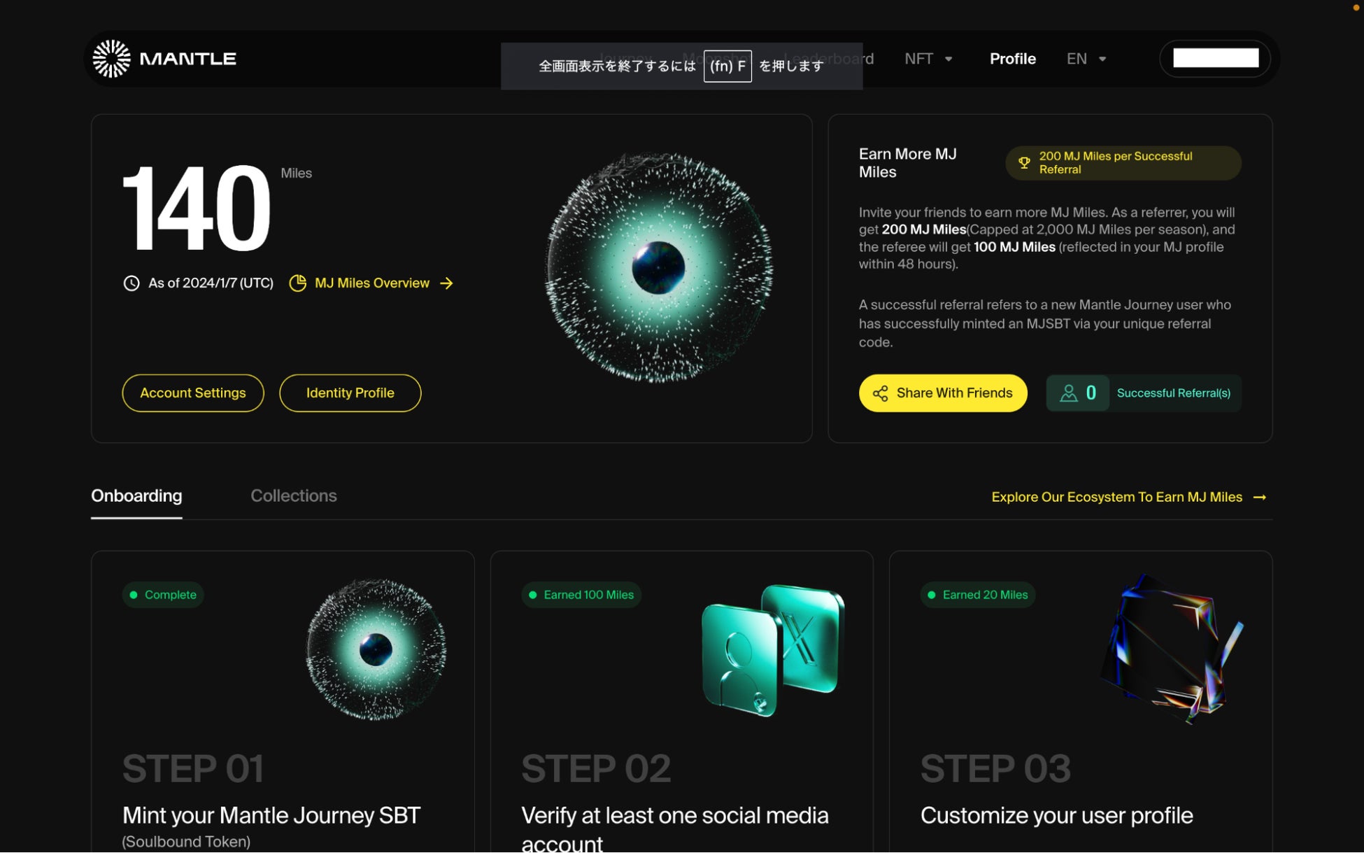 Mantle Journey は、オンチェーンとオフチェーンの両方で、Mantle Network上のアクティビティとインタラクションをインデックス化し、Journeyマイルに変換します。Mantle JourneyマイルによってMantleエコシステムの数多くの特典が利用可能になります。