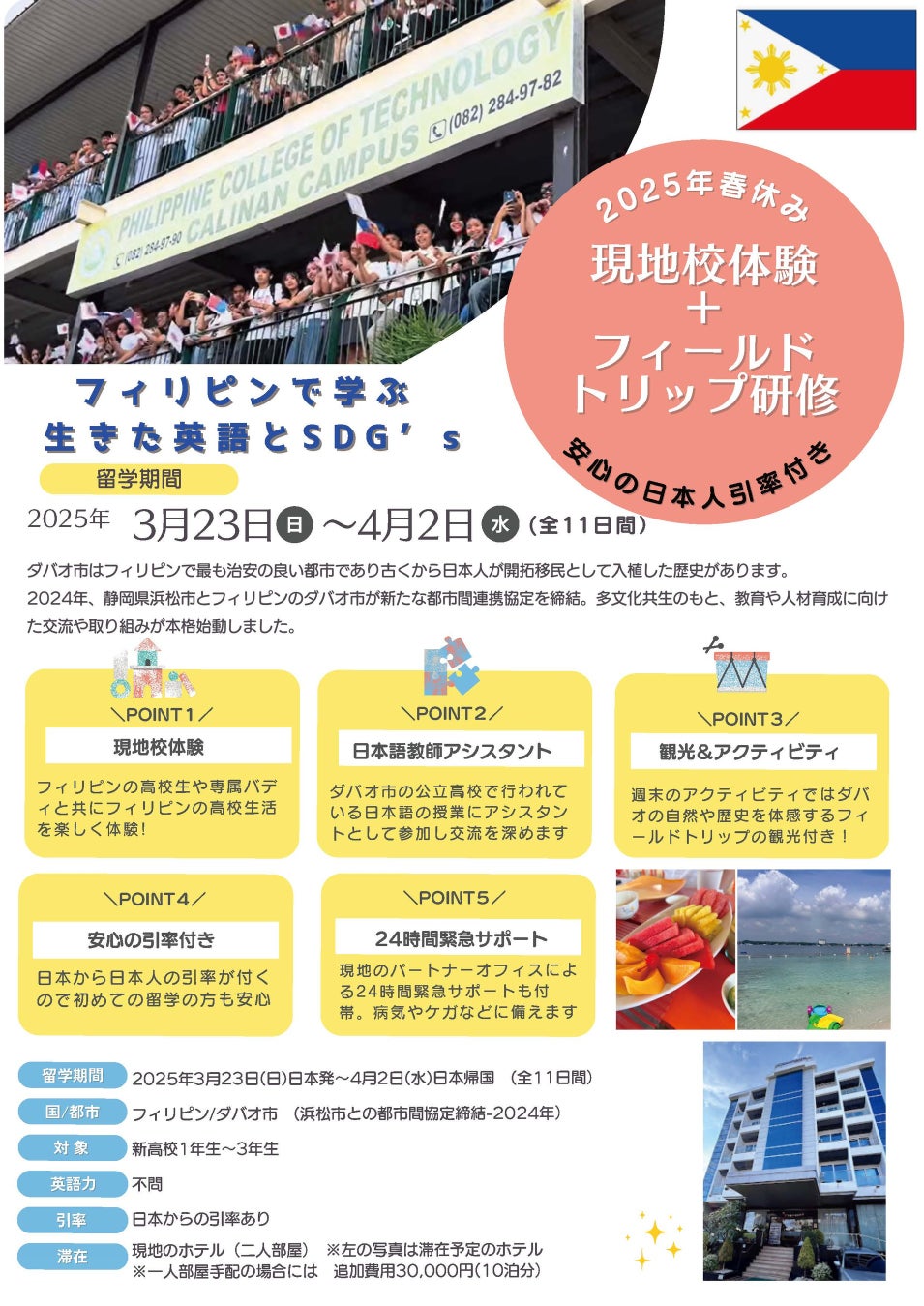 浜松市がフィリピン・ダバオ市との都市間連携協定を締結したことから、この春、高校生を対象にダバオ市での現地校体験とSDGsを学ぶフィールドトリップ、英語留学を行うツアーを開催します