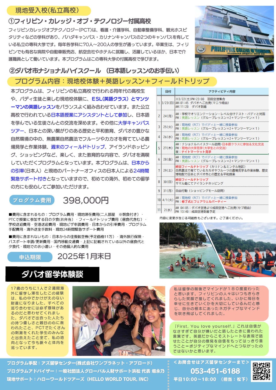 一般社団法人グローバル人財サポート浜松(静岡県浜松市、代表理事堀 永乃)は、アズ留学センターを運営する株式会社ワンプラネット・アブロード(静岡県浜松市、代表取締役鈴木雄也)と業務締結を行い、日本からフィリピン・ダバオ市への留学プログラムを開発しました。