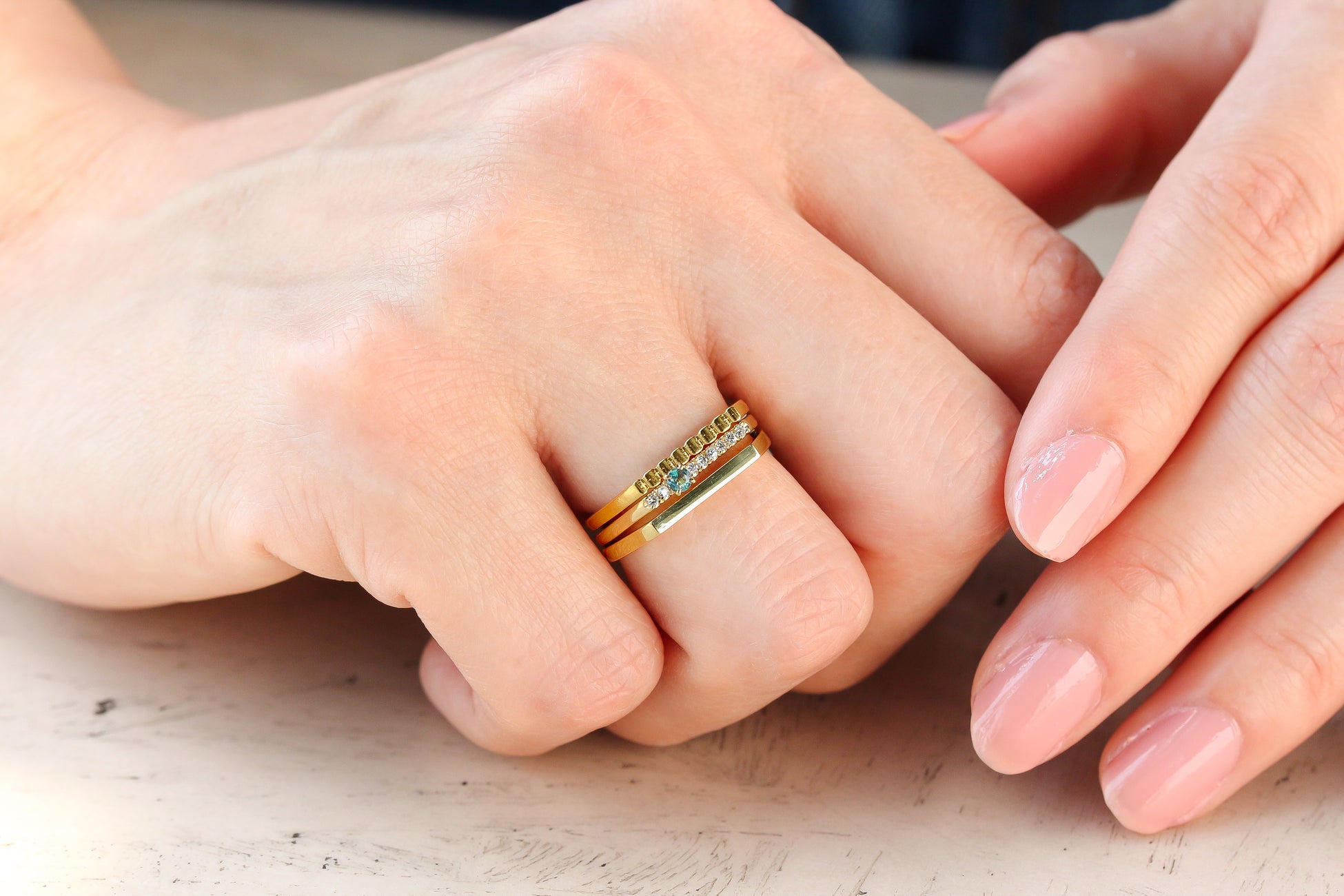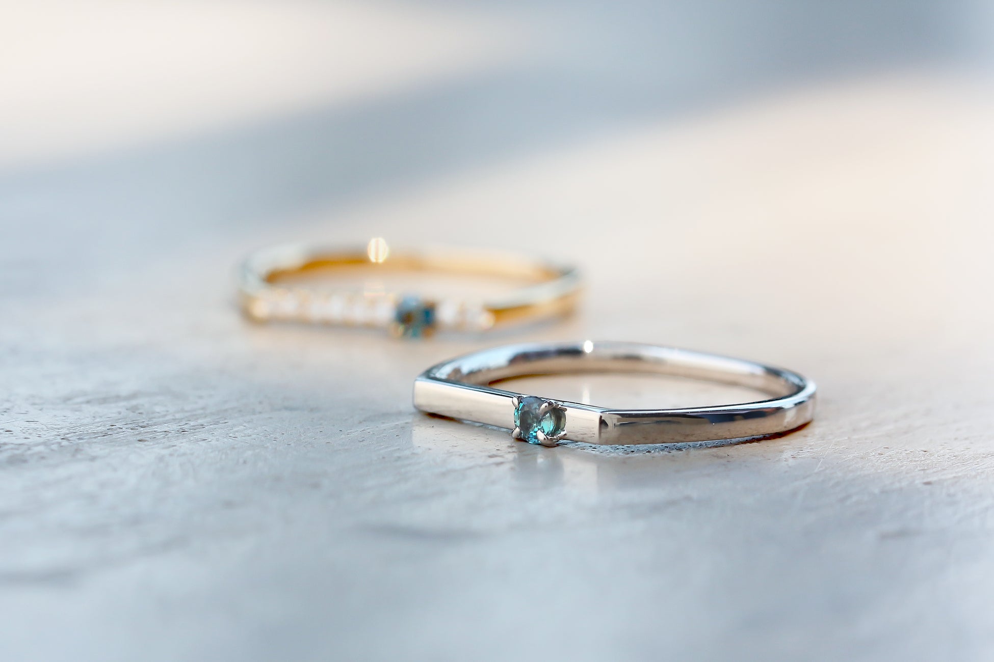 ぷっくり×フラットな「クール可愛い」形状に、今回は「光の当たり方で色が変わる」希少なアレキサンドライトの石を使用しました。
