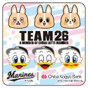 千葉ロッテマリーンズ公式ファンクラブTEAM26会員の方限定で、先着1,000名さまにオリジナルピンバッジをプレゼント!千葉ロッテマリーンズのマスコットキャラクターである「マーくん」と、当行イメージキャラクターである「ちばコーギー」がコラボしたデザインです。