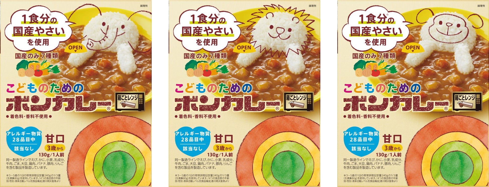 リニューアルした『こどものためのボンカレー』は、これらの悩みを解消するべく、1食分の国産野菜がとれるよう野菜の使用量を増やしました。またアレルギー物質への対応を28品目(食物アレルギー表示対象品目全て)に拡大し、これらのアレルギー物質を含む原材料を使用せず作りました。さらにパッケージを大幅に変更し、子どもが喜ぶ3種類の楽しいイラストを施しています。親が子どもに食べさせたいカレーとして、より選んでいただきやすくなりました。