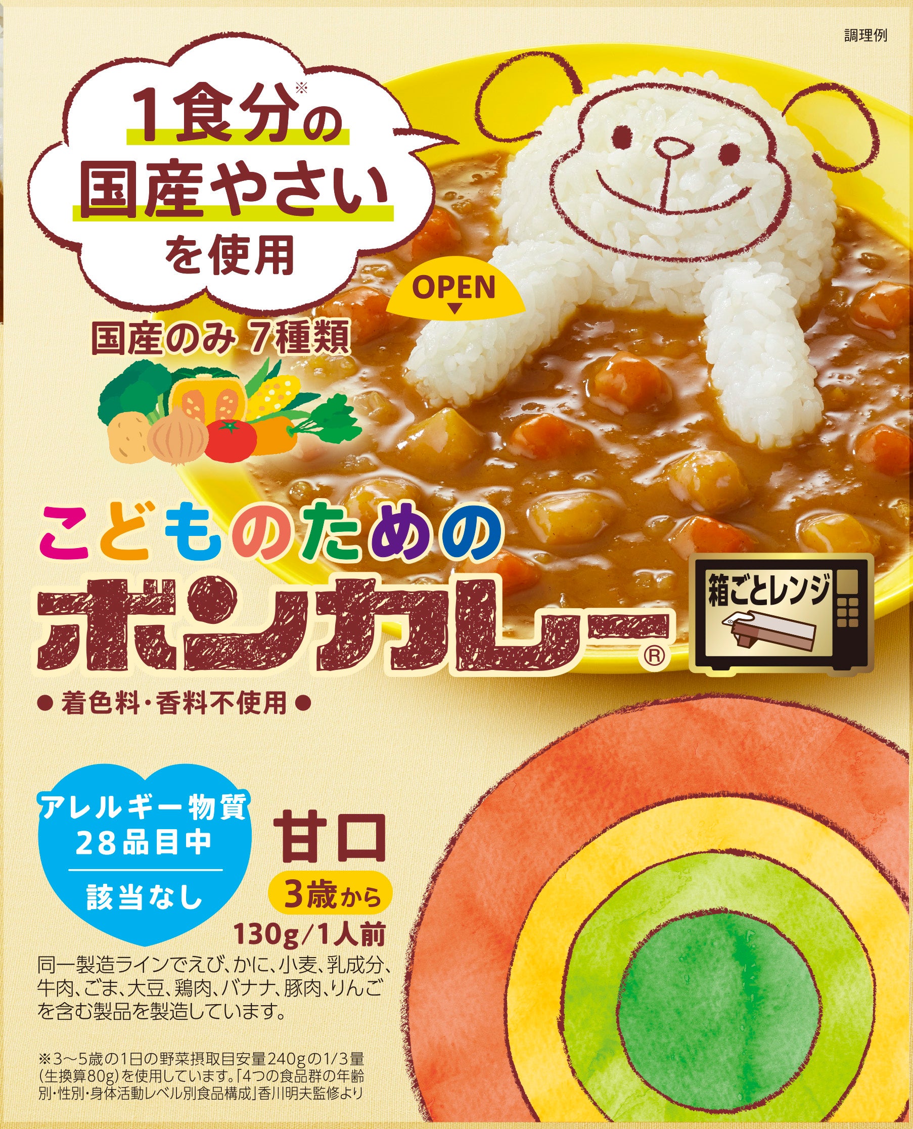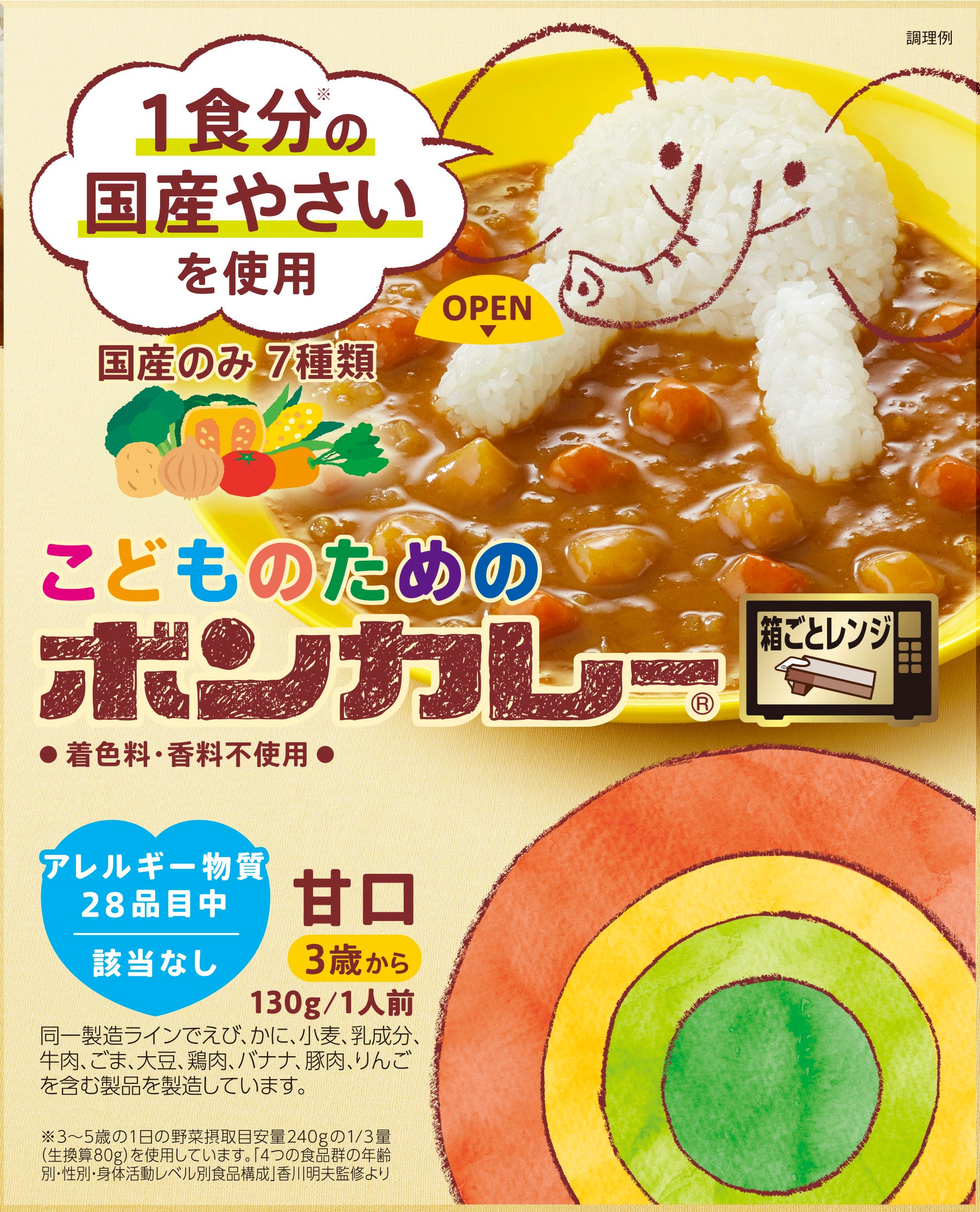 ■製品特長:1食分の国産野菜を使用。食物アレルギー表示対象28品目中、該当なし。7種類の国産野菜の甘みと旨みがとけこんだ、まろやかな甘口カレー。対象年齢、3歳から。箱ごと電子レンジ調理可能。