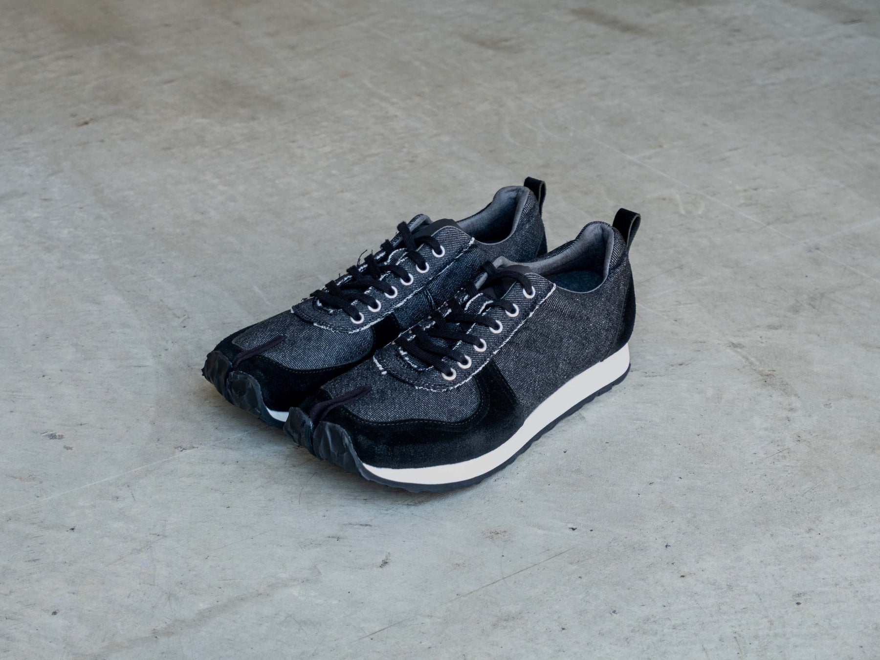 シュータンの内側には「釜浅商店 × tabito」のダブルネームを配し、アッパー(甲部分)にはブラックデニムとベロア(牛)を使用。釜浅らしい黒を基調にした別注デザインとなっています。タウンユースとしてもちろんのこと、長時間立ち仕事をする料理人やフロアスタッフにもおすすめです。