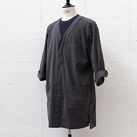 ラウンドネックを前にすれば作業しやすいプルオーバー、ボタン側を前にすれば羽織として外出も可能です。