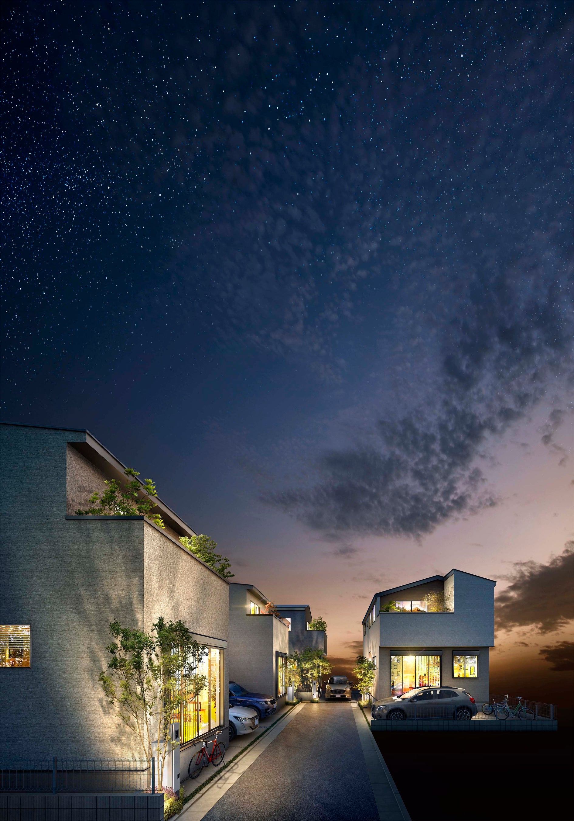 スタイリッシュなモノトーンに木調のアクセントがナチュラルなあたたかみを与える外観が印象的な、全4邸。雨で汚れを洗い落とすセルフクリーニングの外壁を採用し、外観の美しさを長く保てます。通り抜けできない敷地内道路に面しているため安全性が高い一方、南からの陽光をたっぷり取り入れられる敷地設計により優れた採光性も確保しています。門柱は宅配BOX付きのため荷物の配達時間を気にせず外出でき、在宅でも非対面での受取が可能です。夜になると「灯かりのいえなみ協定」で自動点灯し、街並みを美しく演出。夜道を明るく照らし家族の帰宅をあたたかく迎えてくれます。