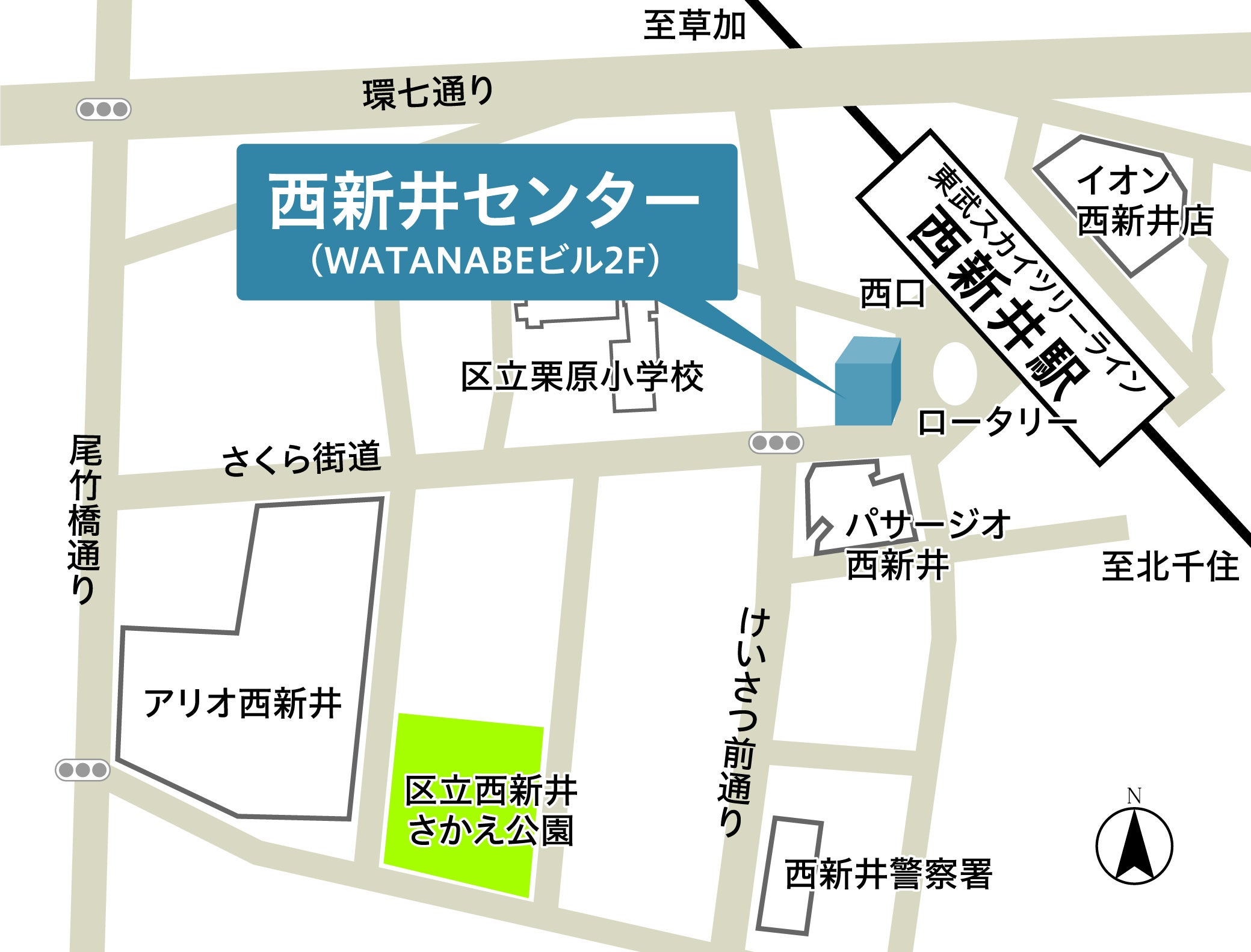 東京都足立区に開設する『西新井センター』は、東武スカイツリーライン・伊勢崎線「西新井」駅、ならびに東武大師線「西新井」駅より徒歩1分、視認性の高い駅西口のバスロータリーに面するビルの2階に出店いたします。