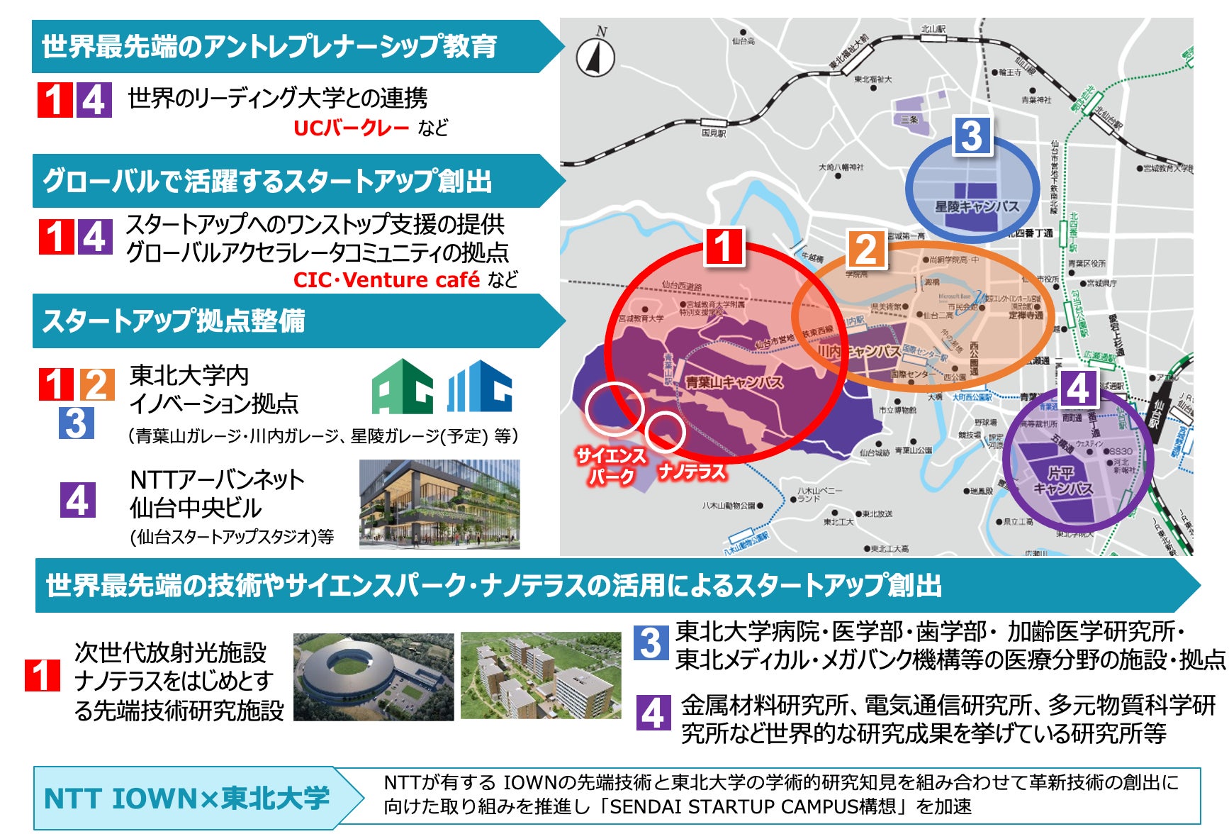 本協定による構想は、スタートアップ創出・発展のための産学官協働による拠点づくりを海外の大学等とも連携し行うもので、東北大学の各キャンパス並びに、現在建設中のNTTアーバンネット仙台中央ビルを主要拠点としてアントレプレナーシップ教育を通じた起業家の輩出と国内外の投資家やアクセラレーター等の支援によるスタートアップの創出を推進していきます。