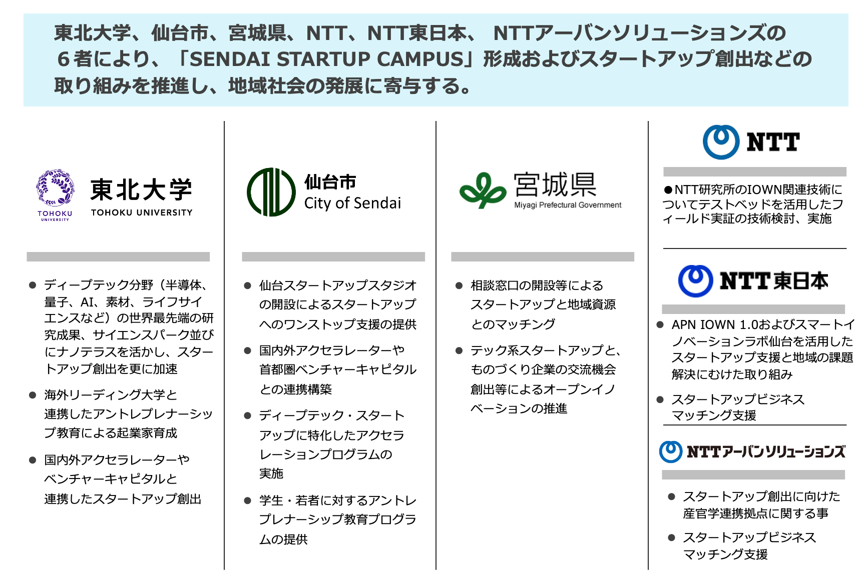 2023年7月13日、仙台市は、東北大学(総長 大野 英男)、宮城県(知事 村井 嘉浩)、日本電信電話株式会社ネットワーク総合研究所(所長 辻󠄀 ゆかり)、東日本電信電話株式会社 宮城事業部(執行役員宮城事業部長 須藤 博史)、NTTアーバンソリューションズ株式会社(代表取締役社長 辻󠄀上 広志)との間で、スタートアップ創出・発展に資する取り組みの推進を目的に「SENDAI STARTUP CAMPUS」形成に係る協定を締結しました。