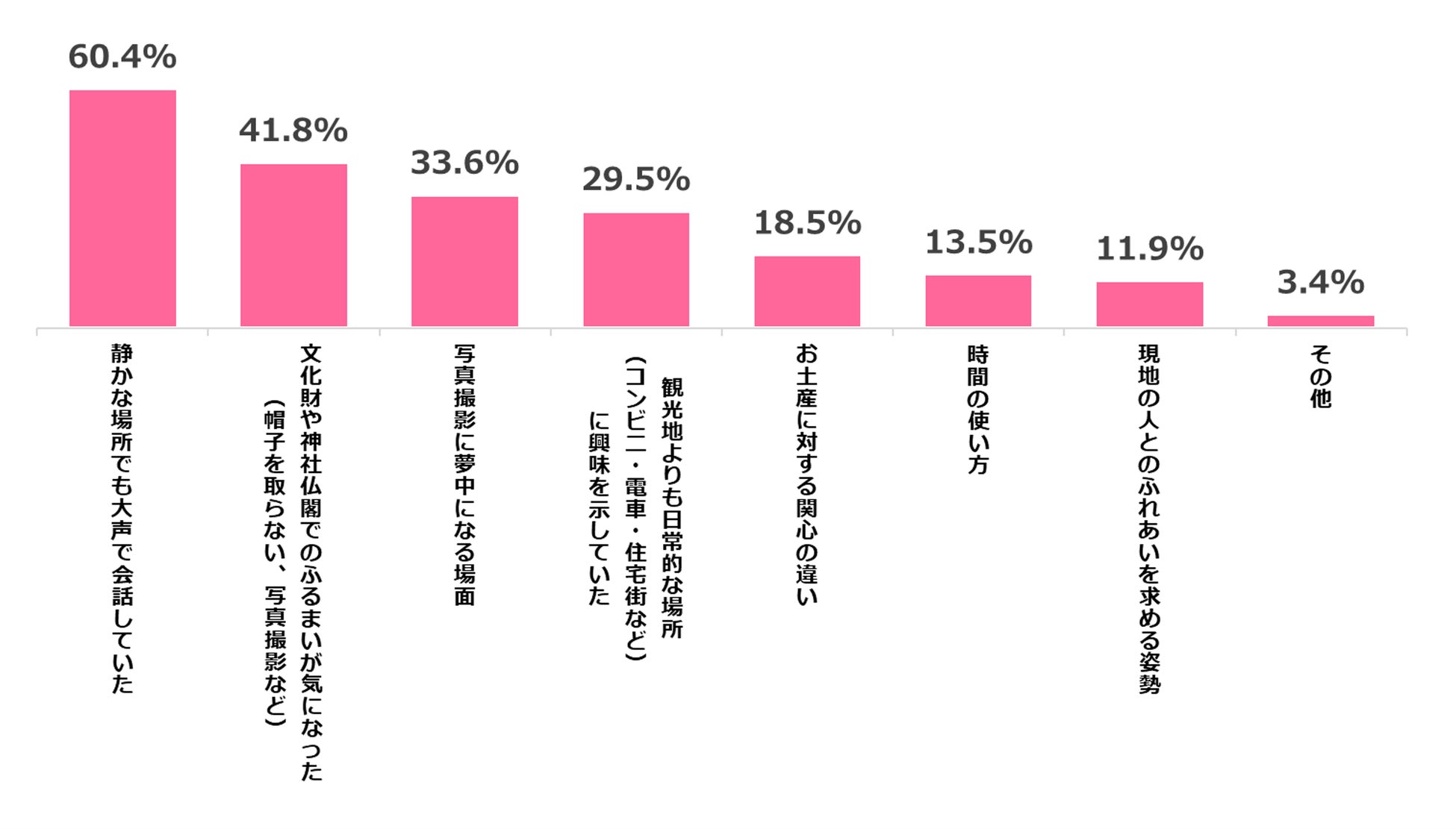 Q. 訪日観光客と日本人で観光に関する感覚が違うと感じるのはどのような場面ですか?(n=672、複数回答)