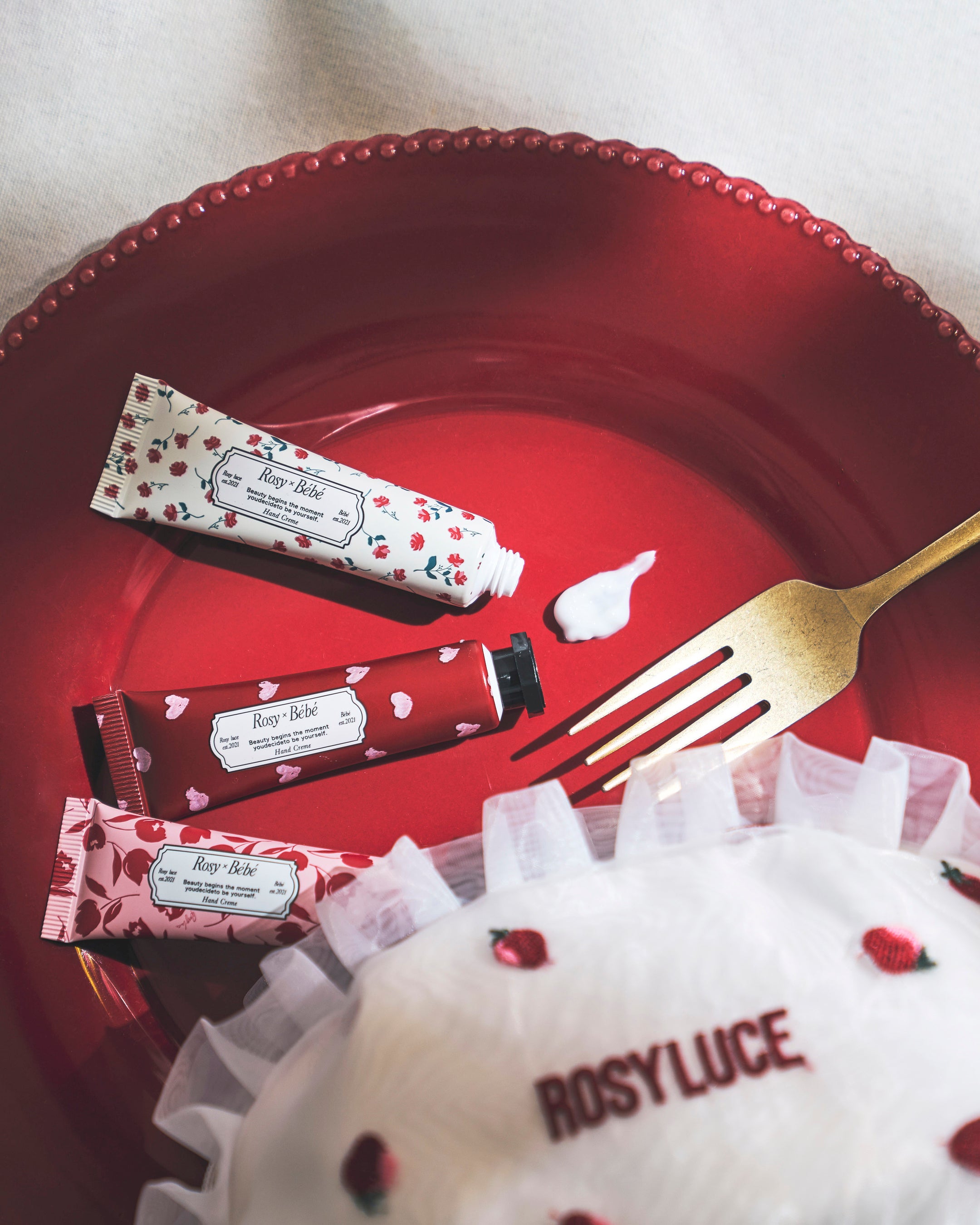 パッケージは、Rosy luceのアイコニックな花柄やハート柄をあしらったオリジナルデザインのチューブ容器、華やかなオリジナルBOXのコンビネーションが特別感のあるデザイン。ハンドクリームはデザインが異なる3本セットになっており、自分へのご褒美にはもちろん、クリスマスギフトにもぴったり。