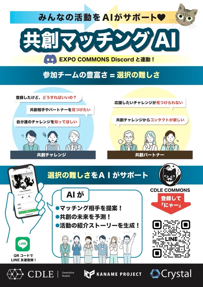 この開発は、Crystal株式会社AIディベロップメント事業部、日本最大級のAIコミュニティ「CDLE(シードル)」の生成モデルチーム、そして株式会社カナメプロジェクトとの協力により実現しました。このAIを活用することで、大阪・関西万博「TEAM EXPO 2025」プログラムに参加する企業は、共創が実現しうる企業の検索と情報の取得が容易になります。