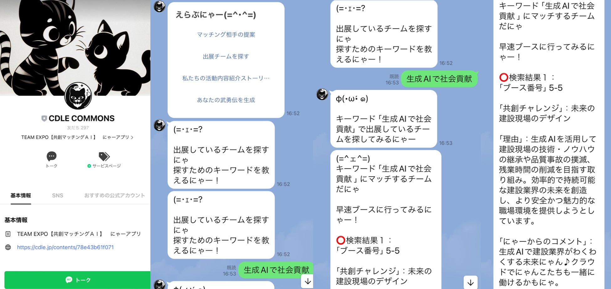 - LINE上でチーム名を入力すると、チームの提供するサービスや興味に合致した関連度の高い上位3チームの情報を提供します。