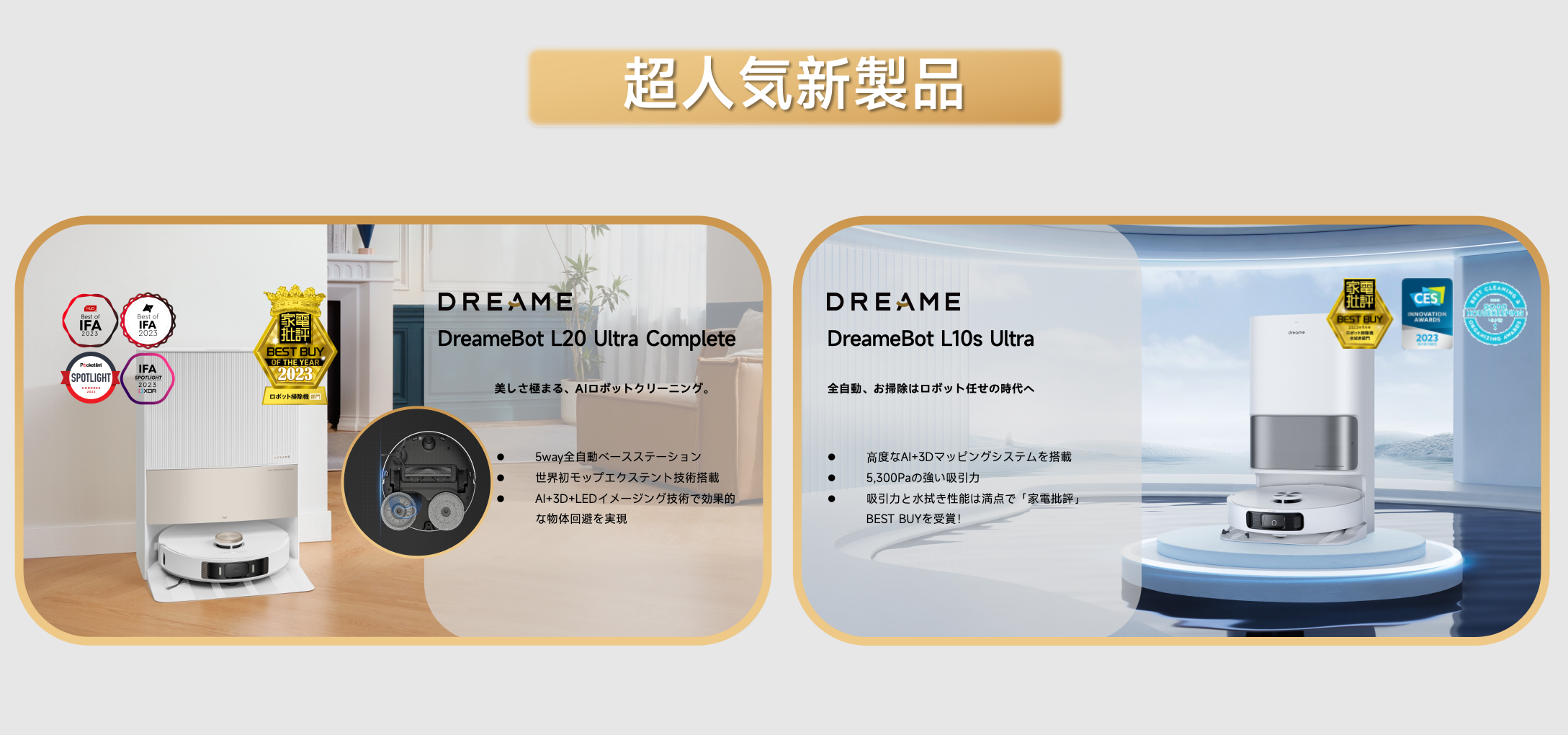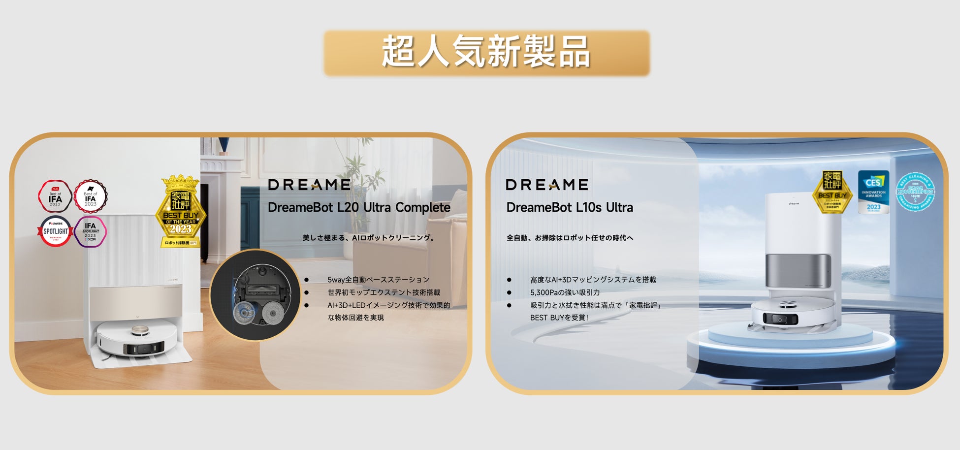 Dreame Technology Japanは2023年2月、自動ゴミ収集ステーション付きロボット掃除機DreameBot D10PlusをAmazon.co.jpで発売し、日本市場に本格参入しました。同年6月にはオフラインでの販売チャンネルの開拓を行い、大手家電量販店ビックカメラ/コジマにて、上位モデルのロボット掃除機DreameBot L10sUltraと全く新しいコンセプトの水拭き掃除機H12Proの販売をスタートさせました。さらに10月には、今秋のドイツのIFA展示会で多くのメディアから「Best of IFA」に選ばれた最上位モデルロボット掃除機L20 Ultra Completeを発売しました。今後もさらなるハイエンドモデルの投入を予定しているほか、日本中を驚かすような最先端テクノロジー製品をリリースしていきます。