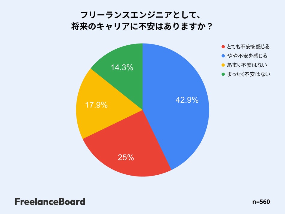 将来のキャリアの不安有無の質問に対して「やや不安を感じる」が42.9%と最も多く、次いで「とても不安を感じる」が25.0%となっており、67.9%のフリーランスエンジニアが何らかの不安を抱えていることが分かりました。