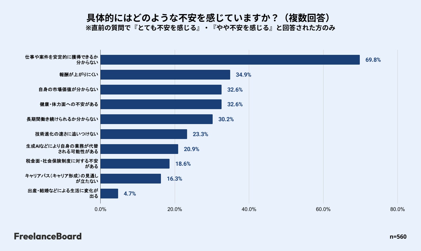 フリーランスエンジニアが感じる具体的な不安は、「仕事や案件を安定的に獲得できるか分からない」が69.8%と最も多く、次いで「報酬が上がりにくい」が34.9%となっています。
