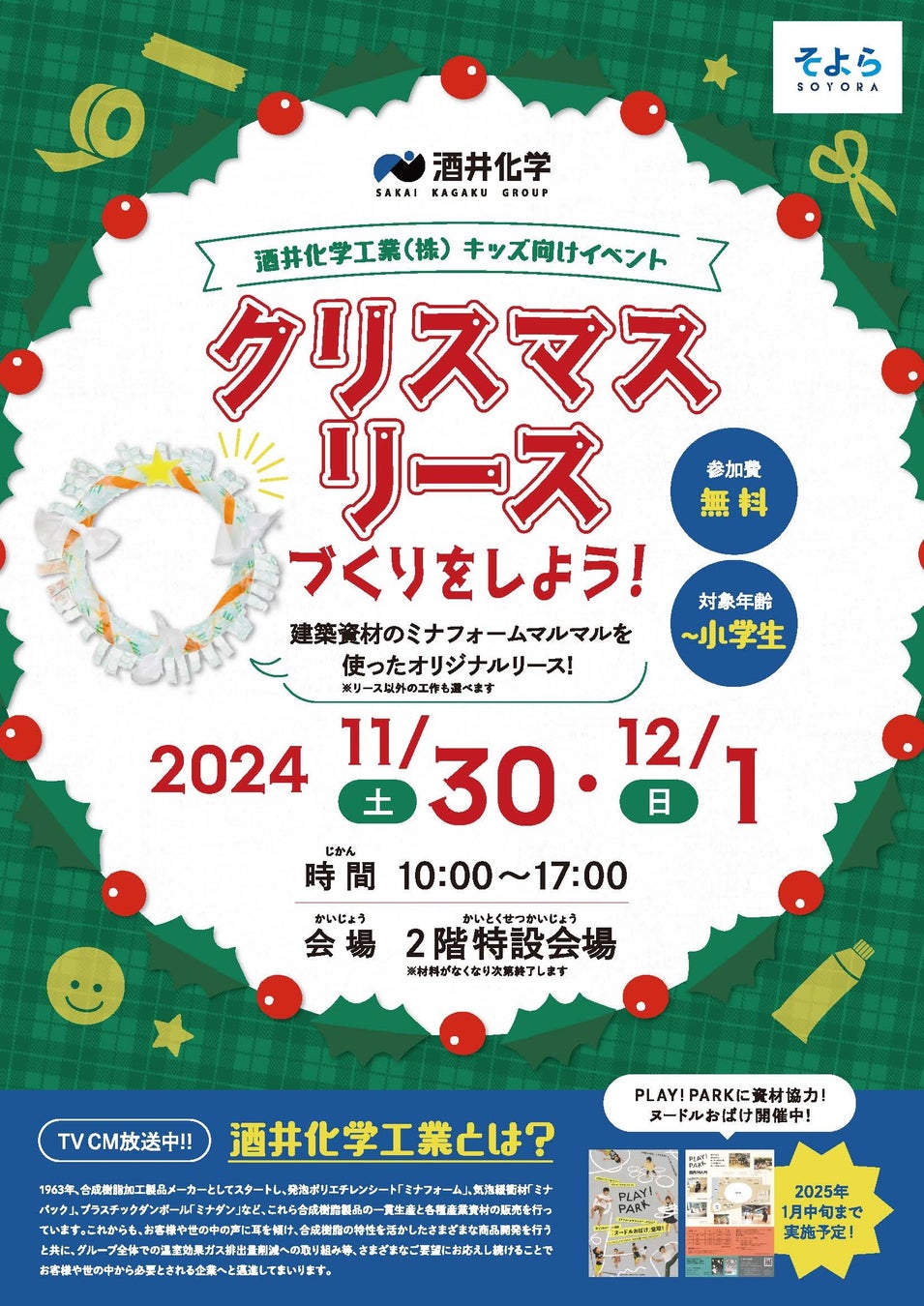 酒井化学工業株式会社は11月30日(土)12月1日(日)、北陸エリア初の都市型ショッピングセンター「そよら福井開発」にて土木建築用資材「ミナフォームマルマル」を使ったキッズ向けイベントを開催します。