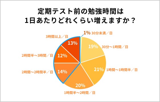 では、定期テスト前は具体的にどれくらい勉強時間が増えるのでしょうか?テスト前に増やした勉強時間は、平均で約2時間でした。普段の平均勉強時間が1日あたり約1時間半なので、中学生はテスト前に1日あたり平均で約3時間半勉強していることになります。