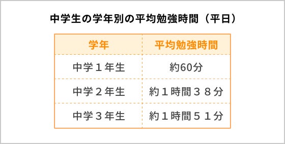 普段の勉強時間は、1日あたり平均約1時間半でした。学年別で見ると、中学1年生は約1時間、中学2年生は約1時間38分、中学3年生は約1時間51分という結果に。学年が上がるにつれて平均勉強時間が増えていることがわかります。
