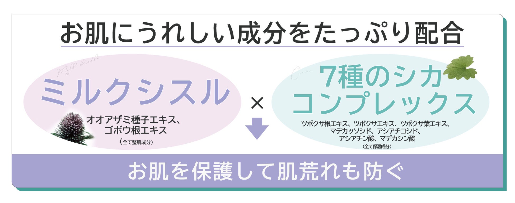 韓国コスメの定番になった”CICA”に加え、皮膚科医ならではの着眼点で”ミルクシスル*¹”を配合している。