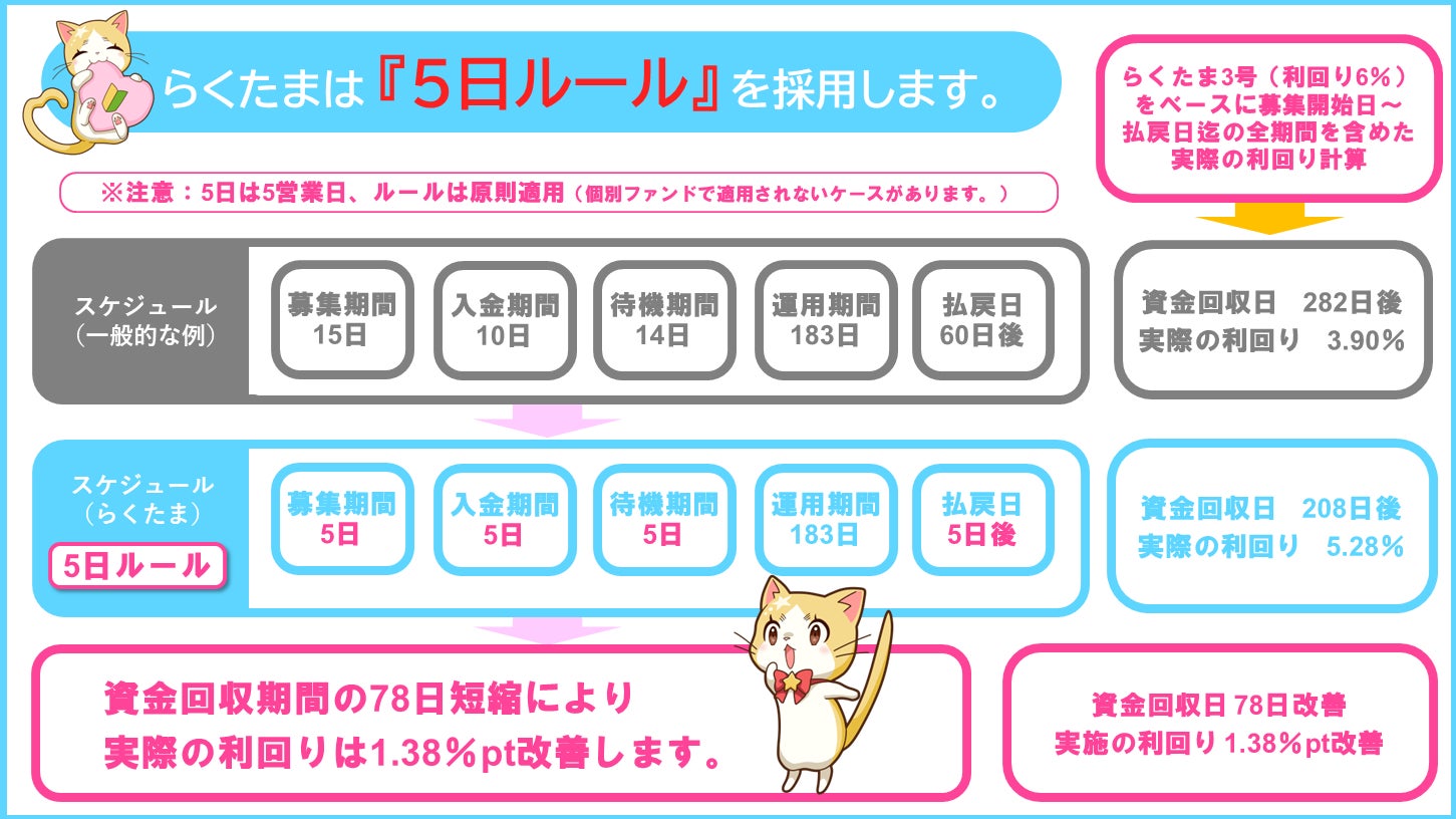 らくたま3号以降のファンドでは、出資者の資金効率を最大限高めるため、らくたまファンド運用スケジュールを見直し、「募集期間」、「入金期間」、「(運用開始までの)待期期間」、「払戻日」の4つの主要日程を(原則として)5営業日以内に短縮する『5日ルール』を採用します。資金効率の向上により、『実際の利回り感が大幅に向上すること(下図参照)』『当選発表まで長期間待つ必要がなくなる』等が、らくたま出資者のメリットです。一方で、応募期間と入金期間は短くなりますので、早めのご応募・ご入金をお願いいたします。また、運用終了後は5営業日以内で配当・償還を受け取れるため、出資者の早期資金回収が可能となります。『らくたま』は今後も出資者ニーズを考えたファンドプランをご提供します。