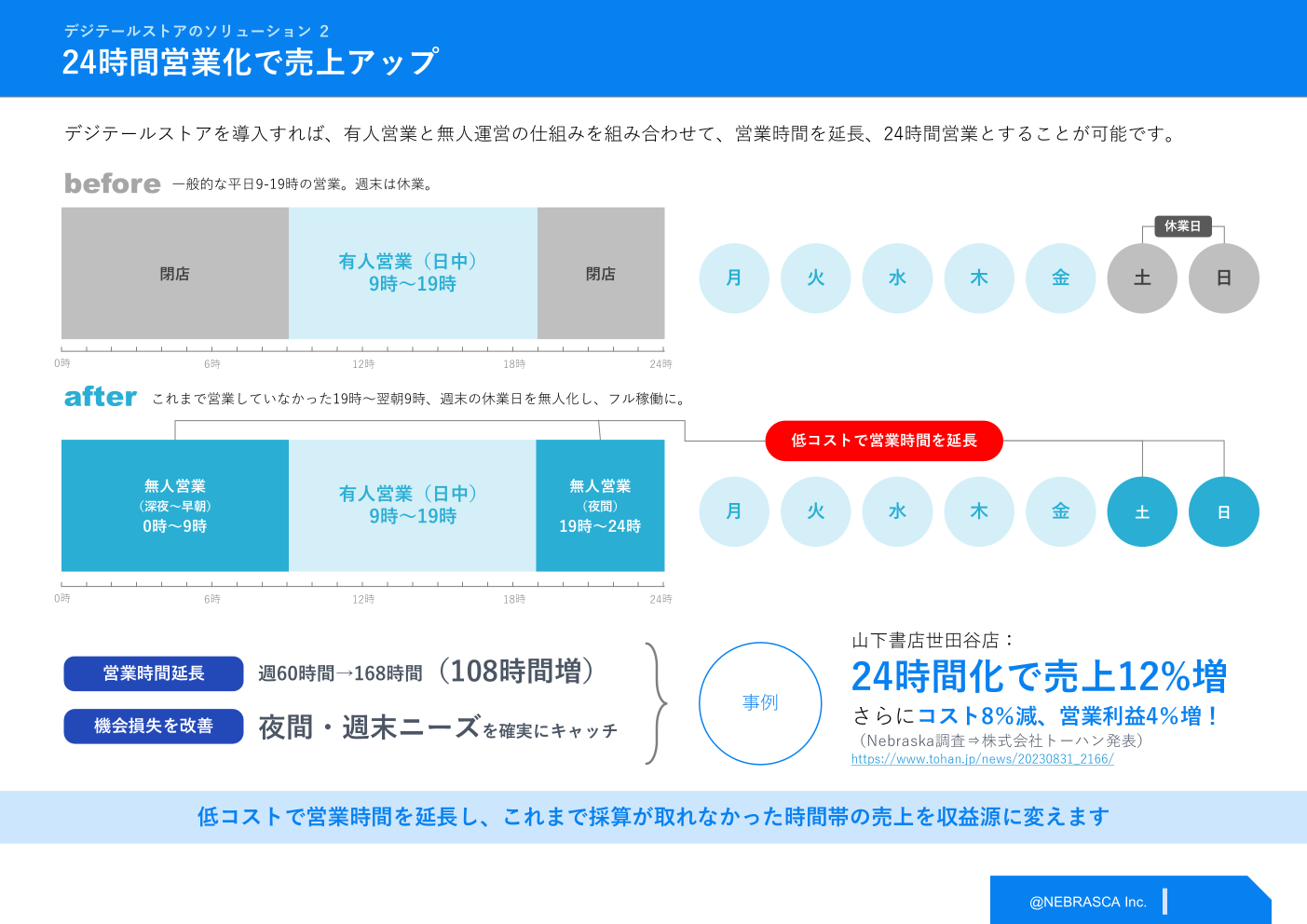 「デジテールストア」は、店舗を完全無人化するだけの仕組みではなく、有人営業と無人営業を組み合わせた“ハイブリッド営業化ソリューション”です。従来は閉店していた時間帯や、有人運営では採算が取りづらい時間帯、さらには休業日まで無人営業化することで、店舗ごとの課題に応じた柔軟な運営モデルを実現します。