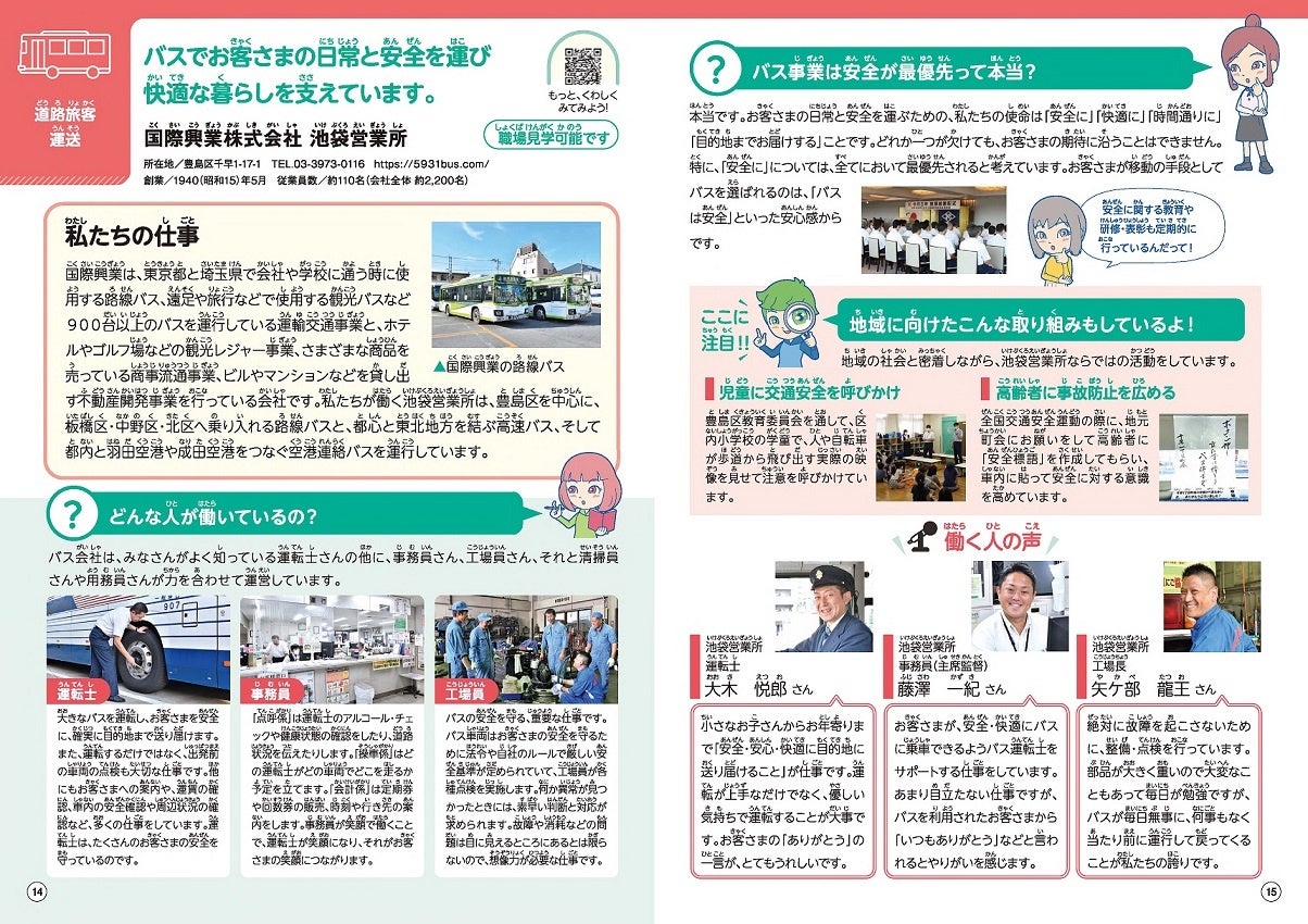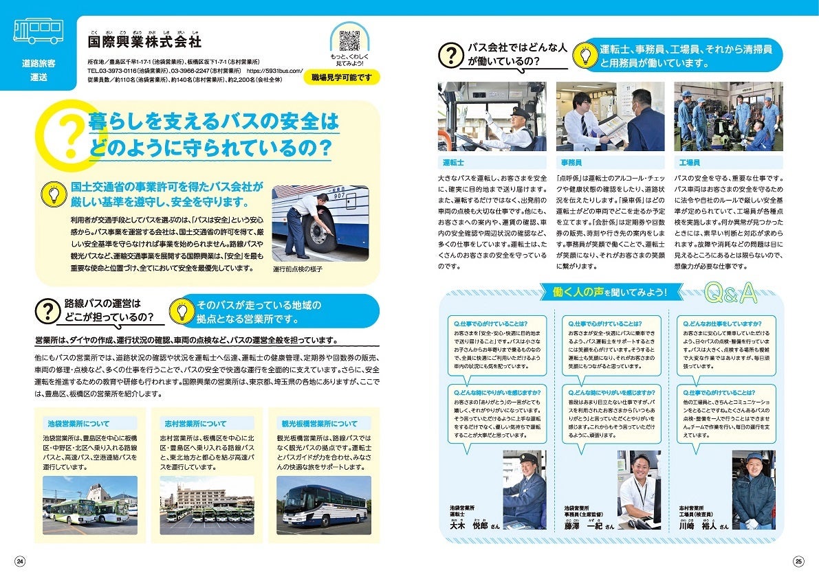 この度、当社営業所がある豊島区、練馬区、板橋区、北区の4地区で小学校3、4年生向けに36,000部、中学校2年生向けに35,500部が発行され、その中で当社のバス営業所の仕事内容や方針について、写真やイラストを用いて解りやすく説明されています。