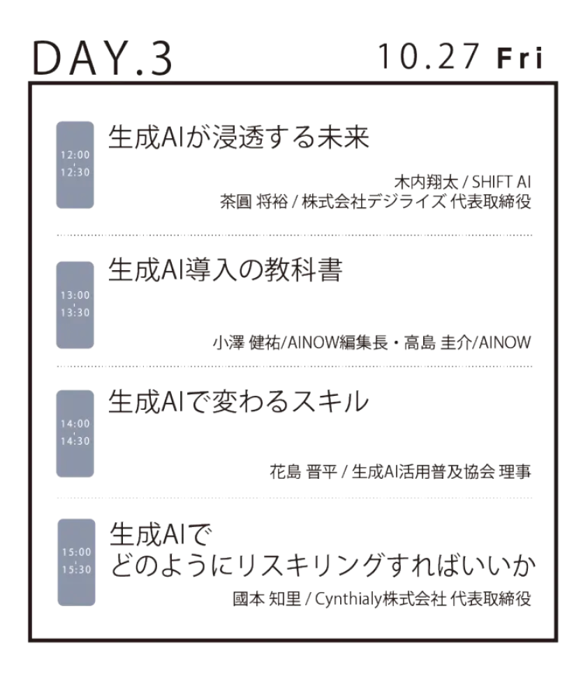 10月27日(金) 15:00~15:30「生成AIでどのようにリスキリングすればいいか」で登壇者を務めます。