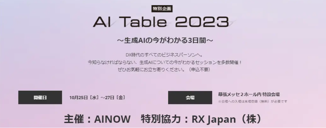 AI Table 2023 ~生成AIの今がわかる3日間~ https://www.nextech-week.jp/autumn/ja-jp/conference/ai-table.html
