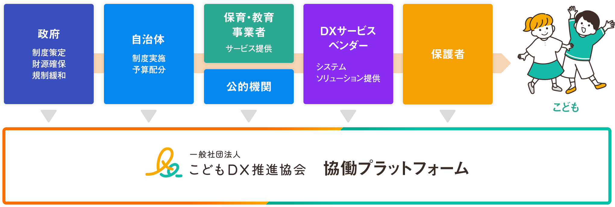 「こどもまんなか社会」の実現を実効性を持って推進する上で行政・自治体・公的機関・事業者がテクノロジーを介して連携しうる「協働プラットフォーム」としての役割を目指します。