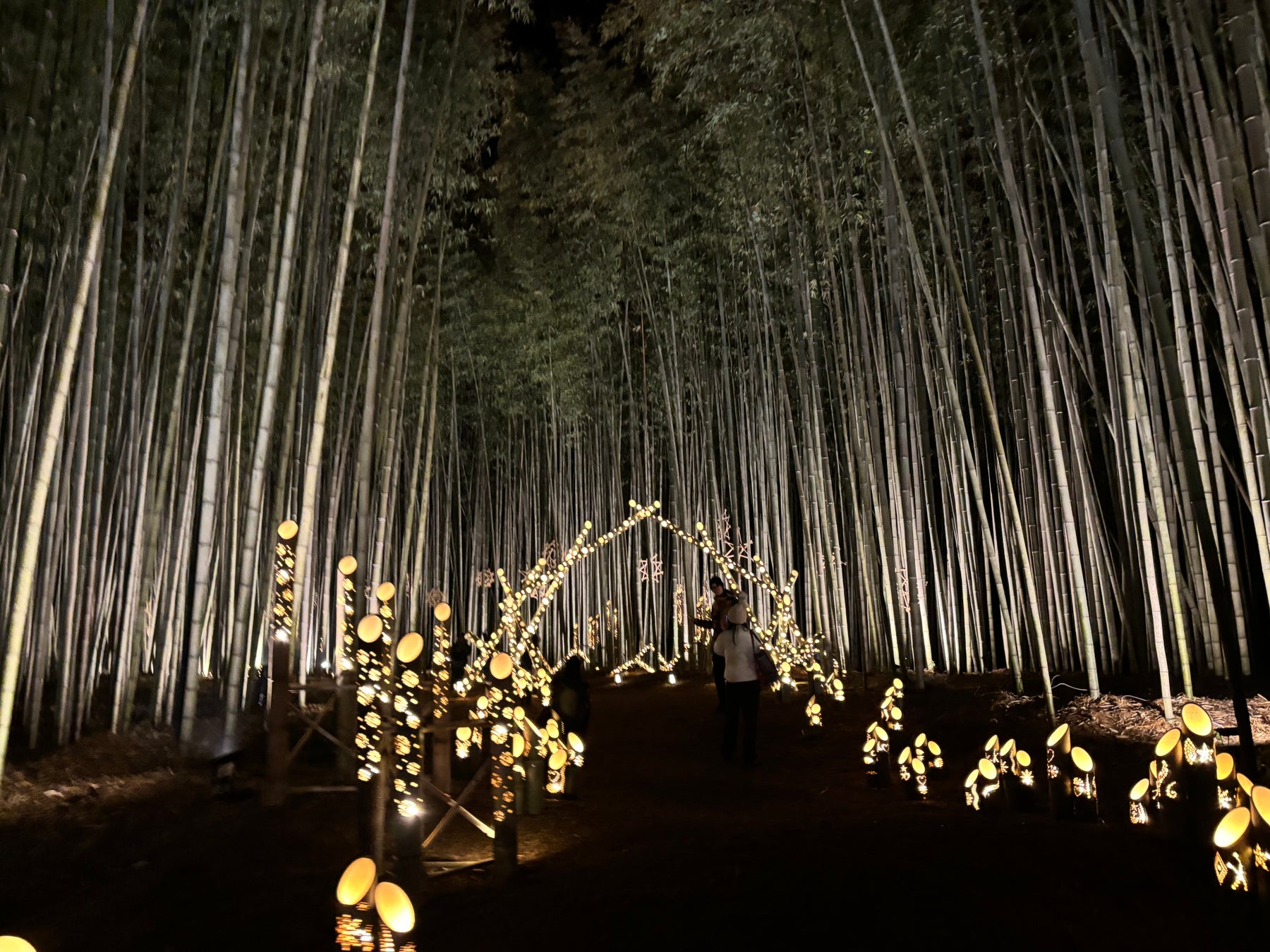 竹あかりの幻想的な光に包まれた竹林はまさに壮観で、内部だけではなく外周から竹林全体にも照明を当てるのは全国でも珍しい演出です。