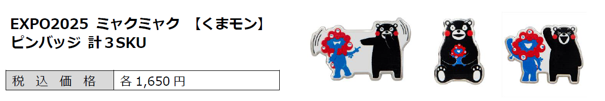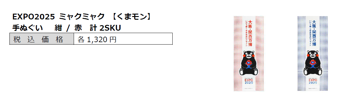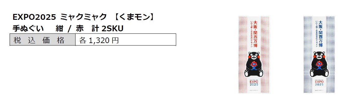 くまモンは、熊本県の営業部⻑ 兼 しあわせ部長として全国でも圧倒的な人気を誇り、大阪・関西万博開幕300日前にあたる2024年6月17日に自治体キャラクターとしては初のスペシャルサポーターに就任しました。開幕半年前を迎える今、全国各地での機運醸成を加速させるべく、ピンバッジや巾着、手ぬぐいやジッパーポーチなどのコラボレーション商品の販売を開始します。