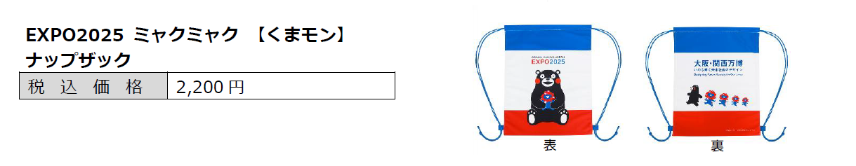 コラボレーション商品は、ミャクミャクとくまモンが談笑する姿や、ミャクミャクを抱きかかえるくまモンなど、豊富なデザインバリエーションを取りそろえています。普段使いにピッタリなナップザックや手ぬぐいから、お土産にもうれしいキーホルダーや思い出の写真にミャクミャクとくまモンが彩りを添えるフォトフレーム、机に置ける小さな卓上のぼりなど用途もさまざまな商品を展開し、2025大阪・関西万博オフィシャルストア(オフィシャルオンラインストアを含む)にて販売します。