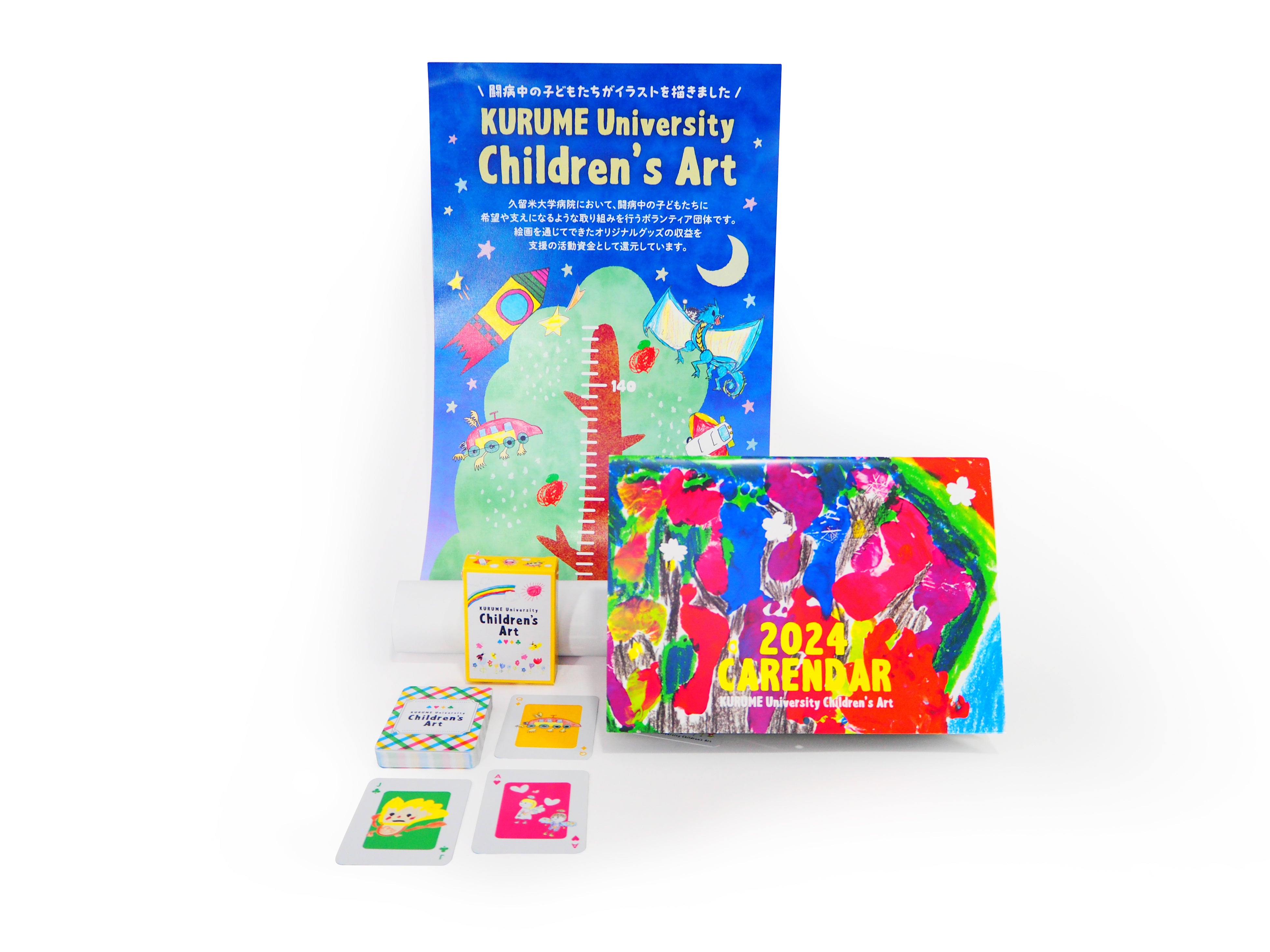 作品説明:久留米大学病院で闘病中の子供たちの絵を使い商品化した、身長測定ポスターやカレンダー、トランプ。同病院に勤務する、小児がんならびに小児科領域の治療に携わる医師を中心としたボランティア組織が行っている、闘病中の子供たちを支える取り組みのひとつで、その収益は小児科領域の活動や病気の子供たちへの支援活動資金として還元されている。
