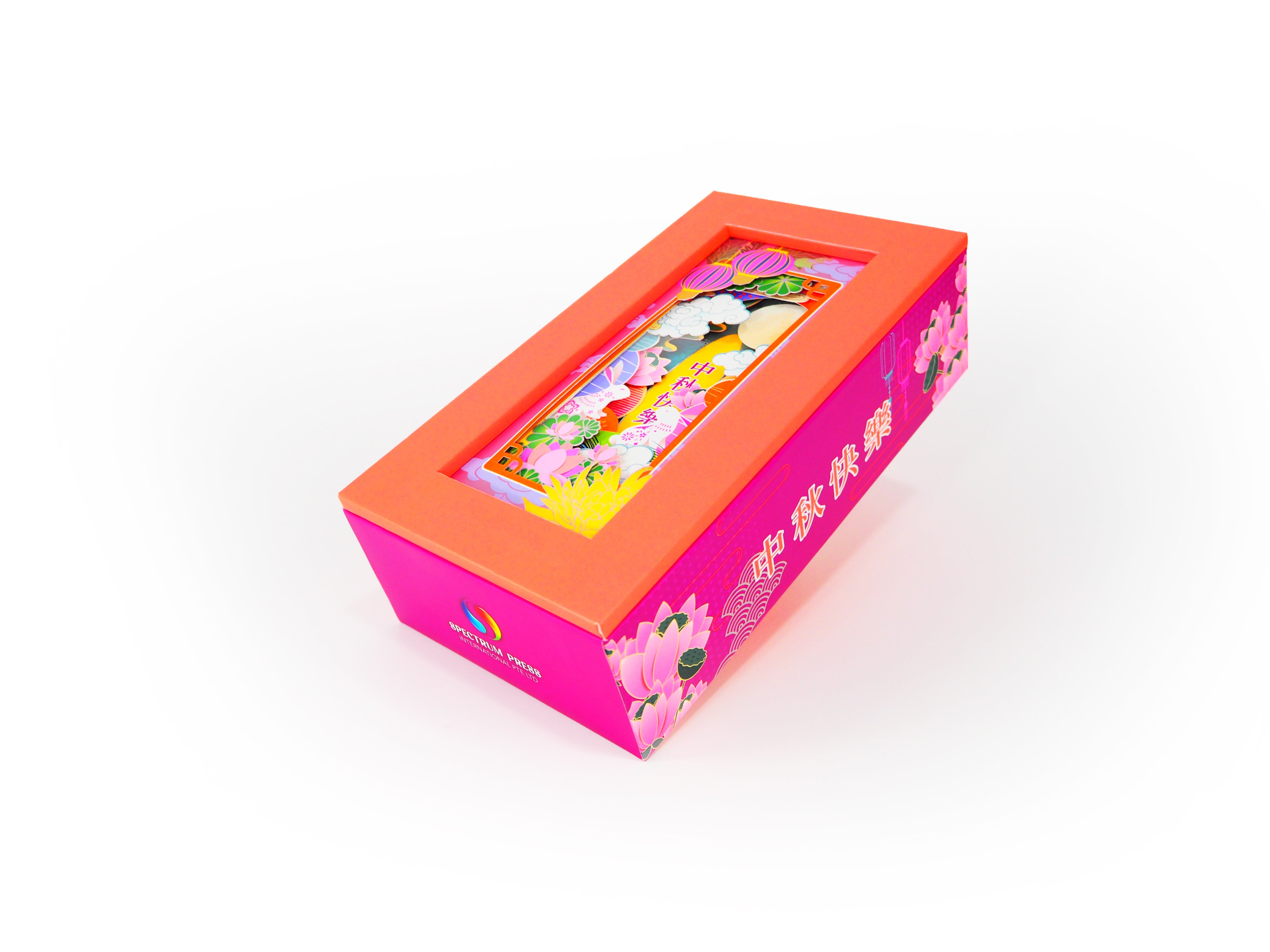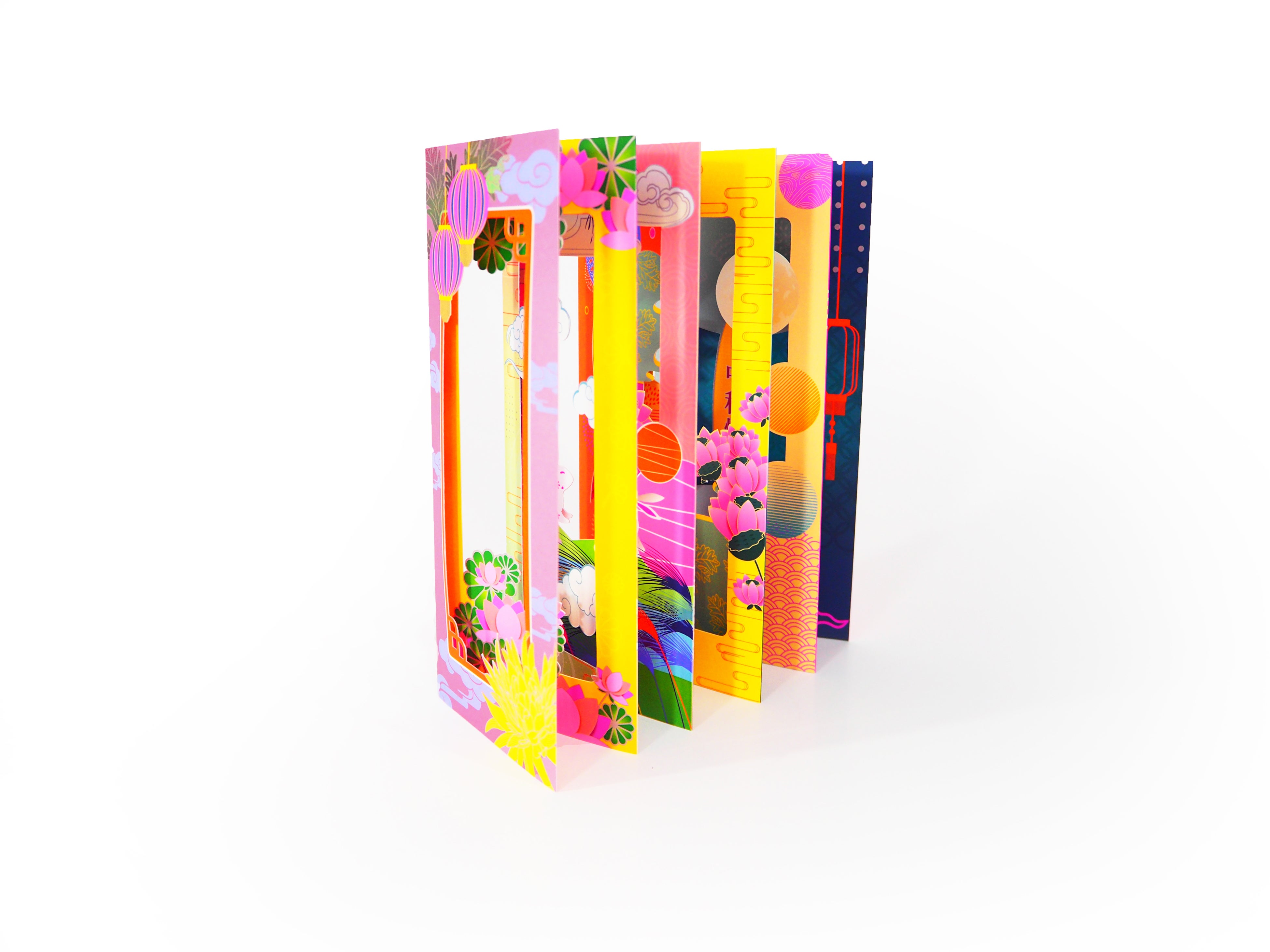 作品説明:中国や台湾などの伝統的な行事「中秋節」で、中秋の名月を祝うために食べるお菓子「月餅」の商品化粧箱。特殊トナーを活用した鮮やかな色彩と、入り組んだデザインが組み合わされた箱の豊かな色合いが、月餅が象徴する、繁栄や幸せ、幸運を表している。ダイカットしたモチーフのデザイン性も高く、独創性と技術の高さが目をひく作品。
