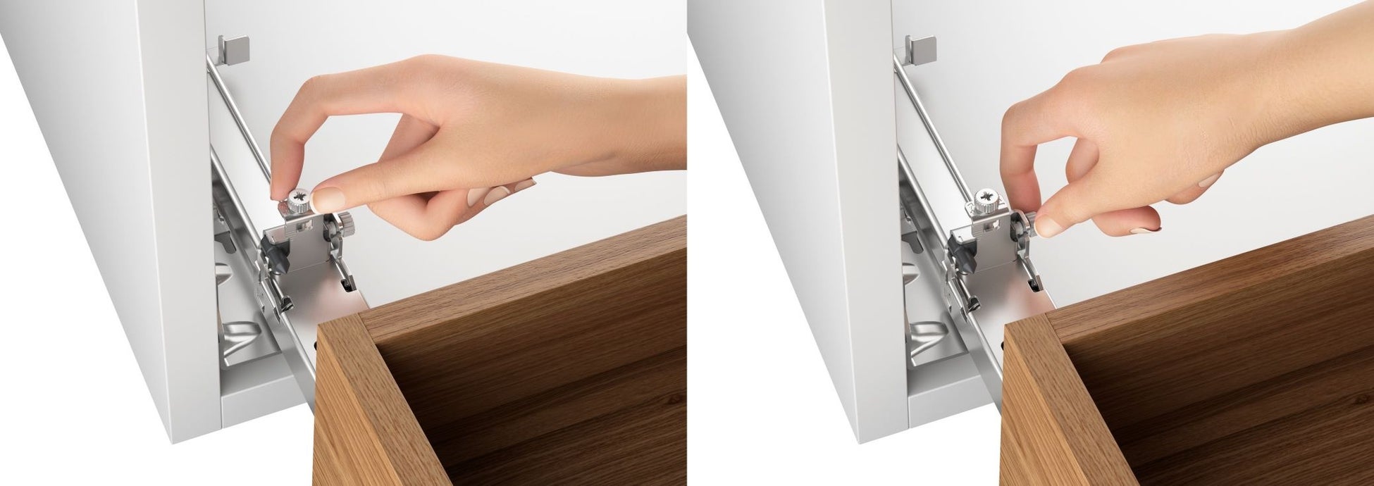 アクトロ 5Dレールは、横方向、高さ方向、奥行方向(※オプション)、傾き、アオリの5方向の調整が可能で、ハンドルレスやミニマルでシームレスなデザインの家具やキッチンの引き出しレールに最適です。