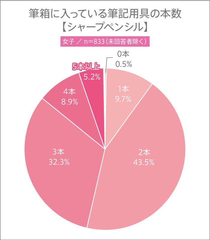 男女共通で“1本”が最も多く、特に女子は7割以上が筆箱に1本入れていると回答。
