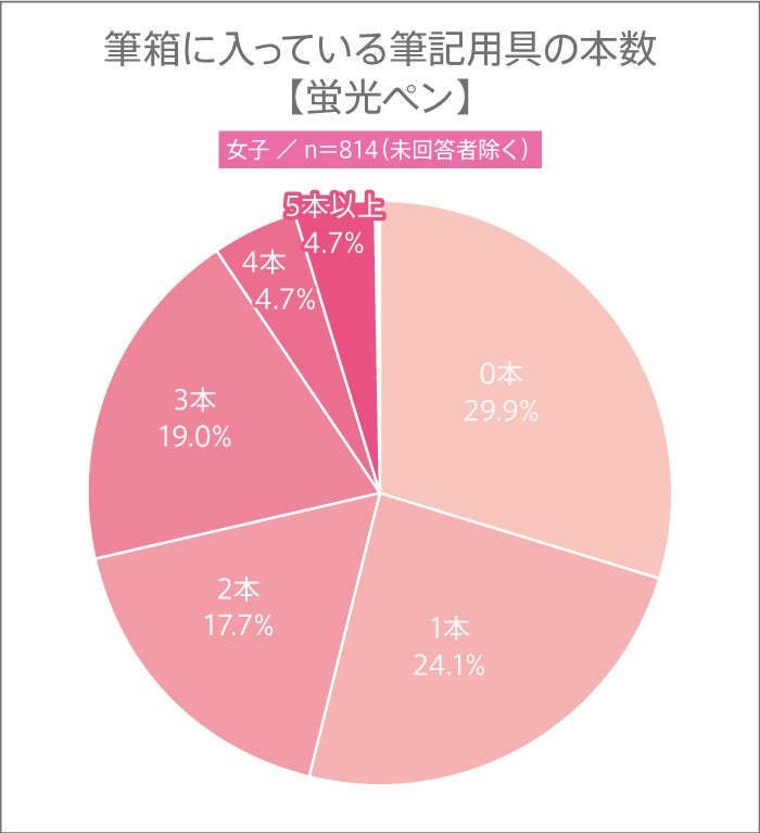 “0本”と回答したのは、男子は21.5%、女子は14.0%で、男子よりも女子の方が筆箱に入れている人が多いことがわかりました。