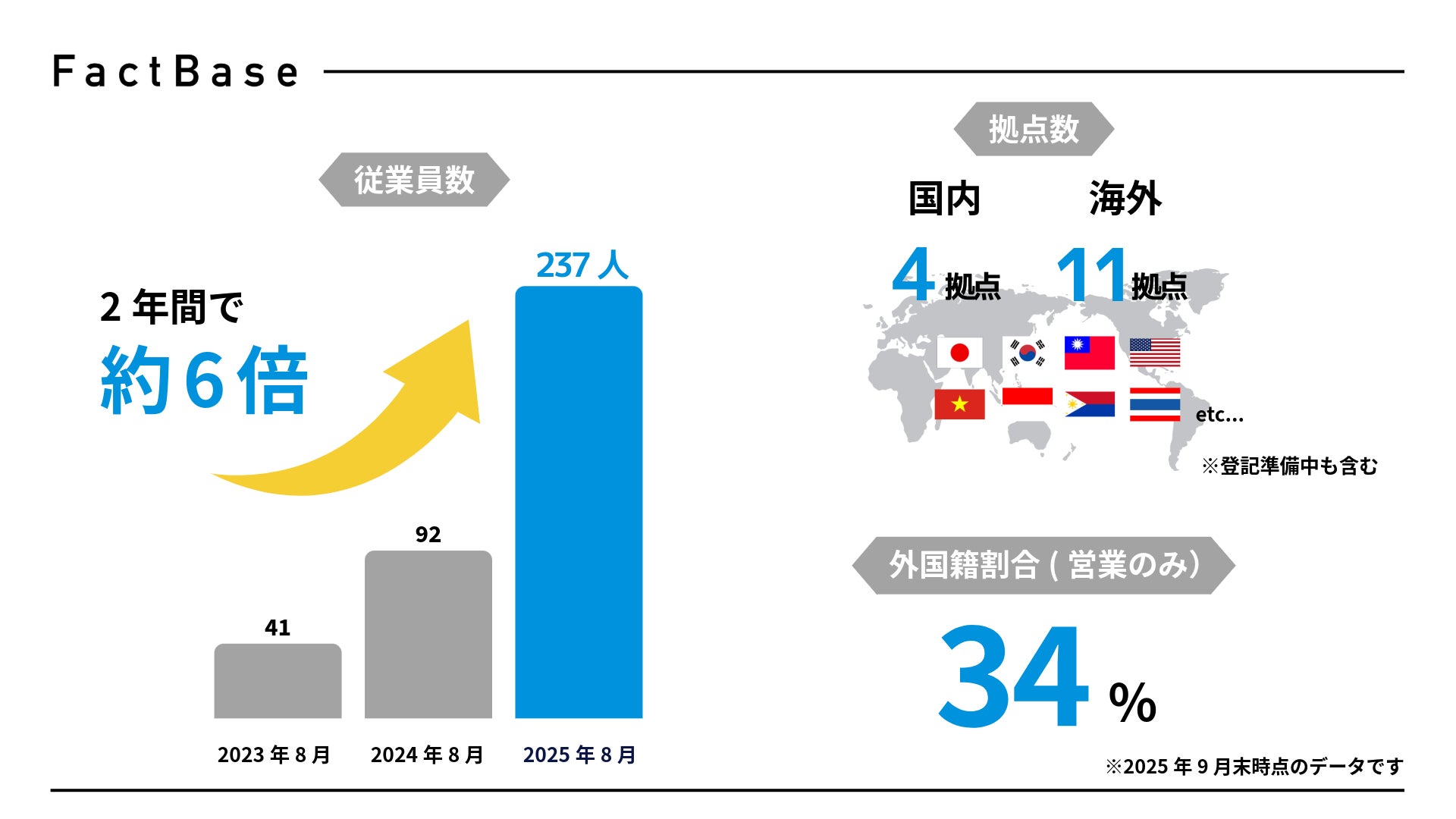 事業成長に伴い、組織規模も急速に拡大しています。従業員数は過去2年間で約6倍に増え、現在は国内4拠点、海外11拠点を展開。社員の約34%が外国籍メンバー(営業のみ)であり、多様なバックグラウンドを持つ人材が活躍しています。