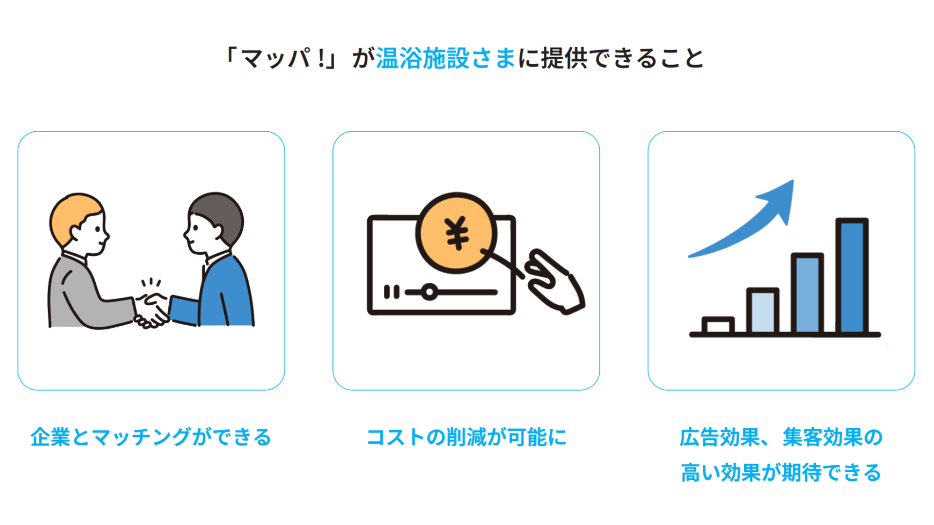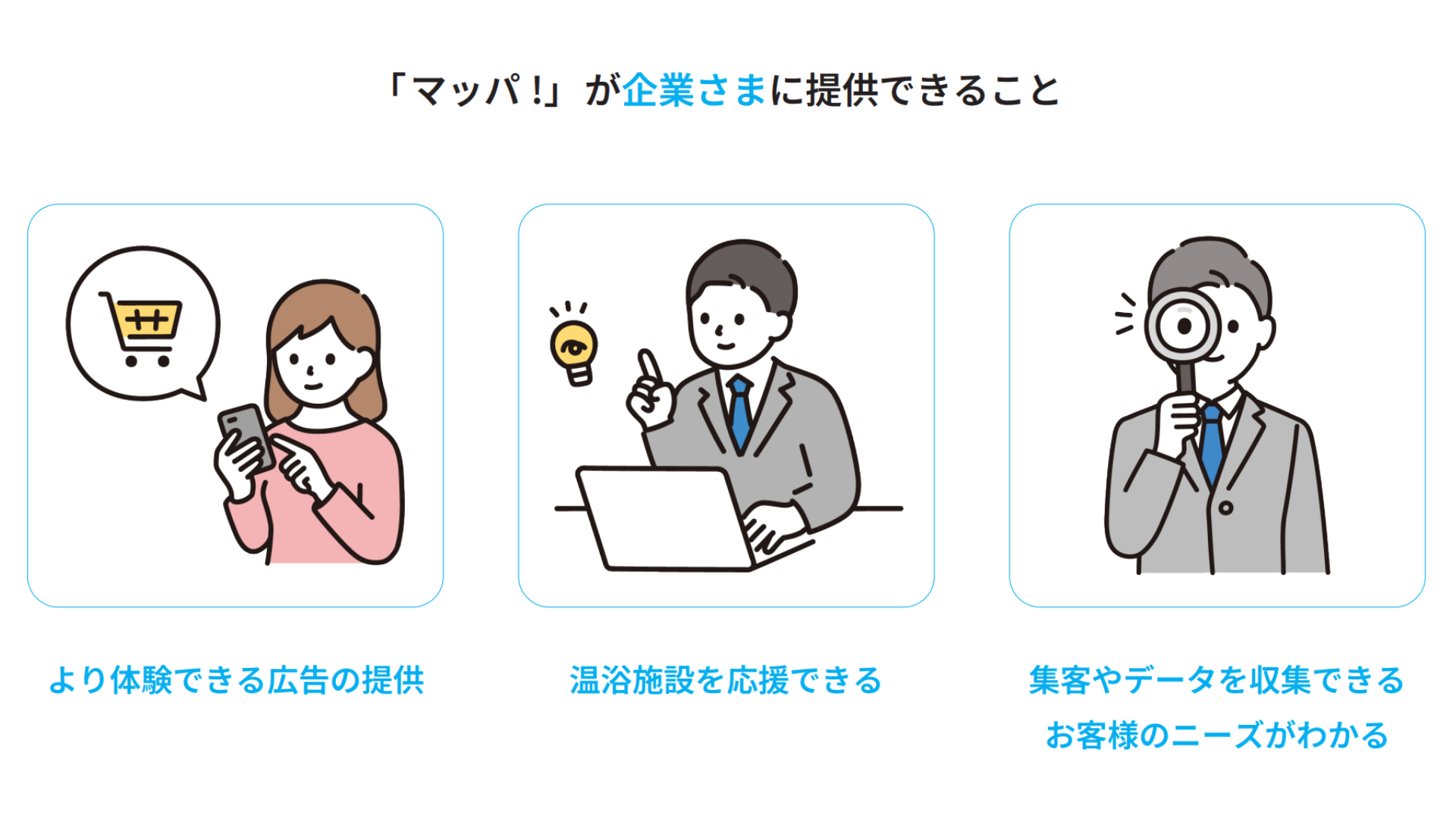 マッパ!では温浴施設利用者向けに商品の認知拡大を行いたい企業様と共に、温浴施設様との取り組みにより温浴業界を一緒に盛り上げていく企業様を募集しております。