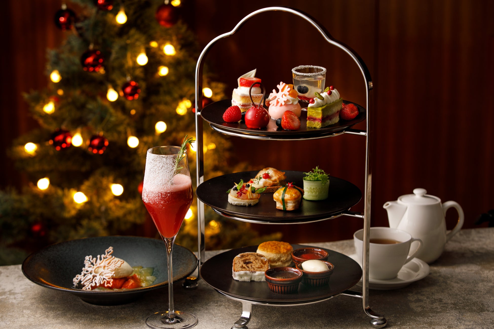オーナメントやギフトボックス、リースなどクリスマスのイメージが散りばめられた、ホリデーシーズンらしい華やかなアフタヌーンティー。フレッシュな苺を使用し、ノンアルコールスパークリングワインでアップしたクリスマス仕様のウェルカムドリンクでスタートするアフタヌーンティーには、旬の苺やピスタチオ、シャンパンを使ったスイーツの数々や、一皿に小さな前菜とメイン料理が再現されたようなセイボリー、ベーカリーシェフこだわりのシュトーレンなど、クリスマスの雰囲気を存分に楽しめるラインナップをご用意しました。バニラアイスクリームを添えた林檎のキャラメルコンポートもシェフのおすすめの一皿です。