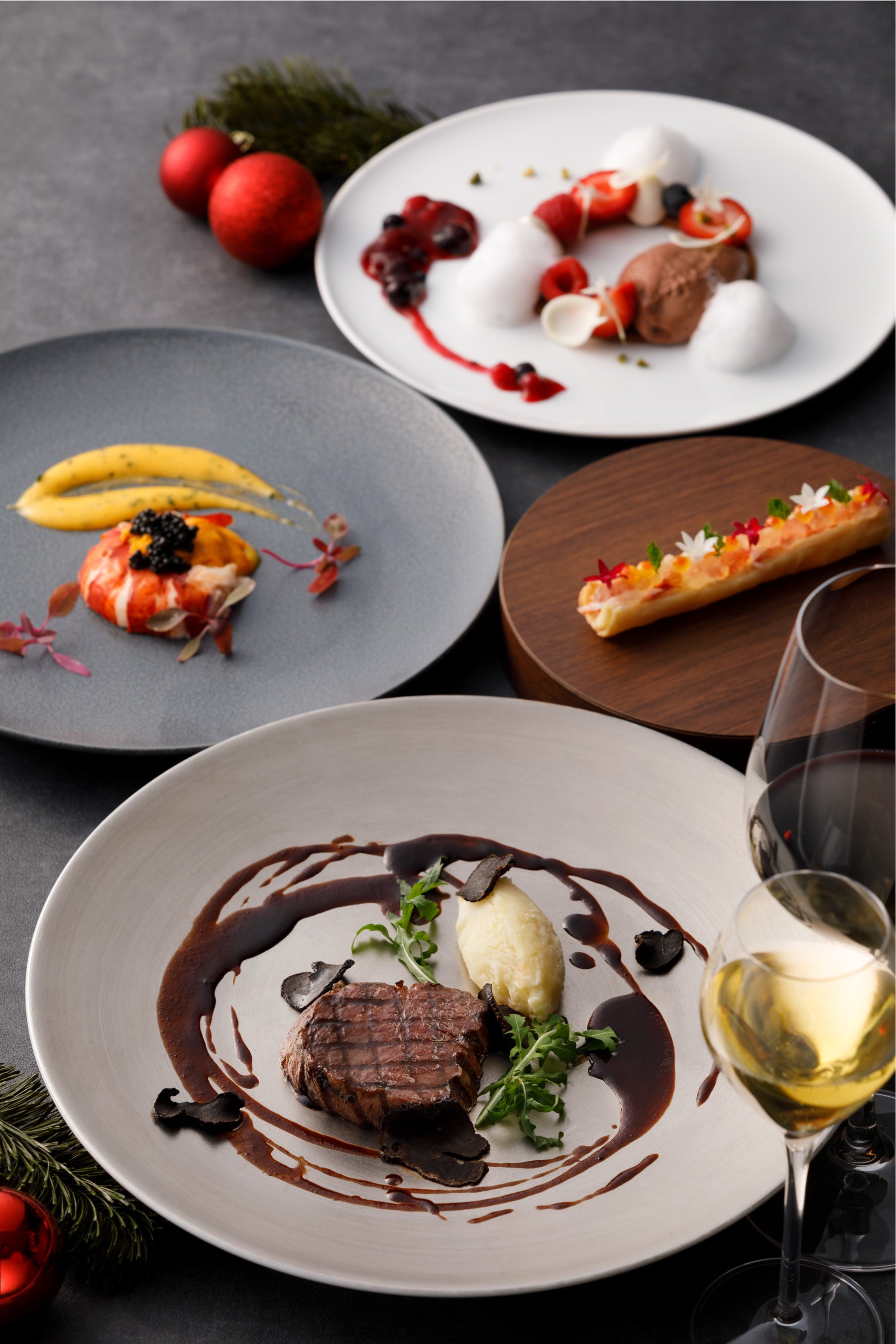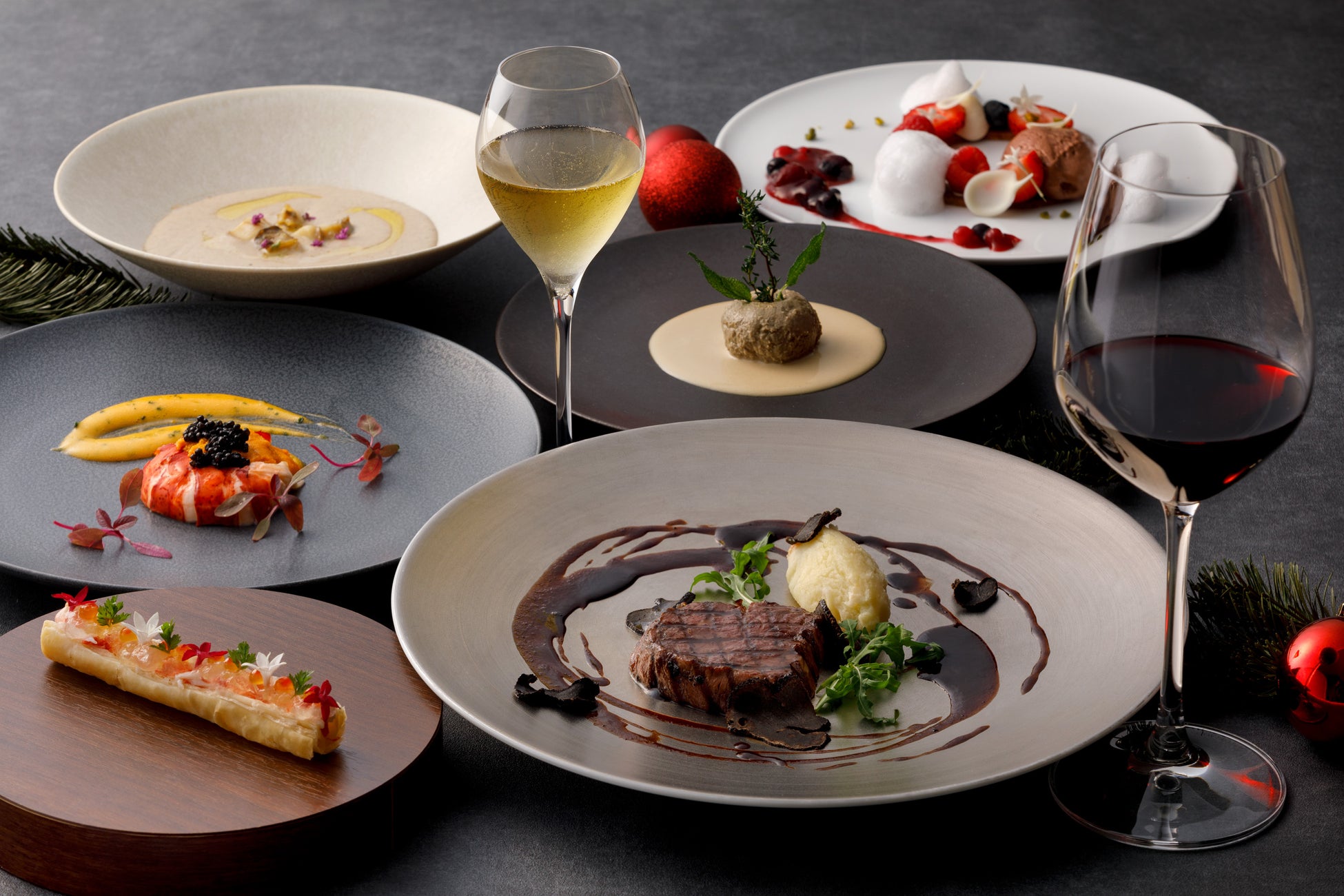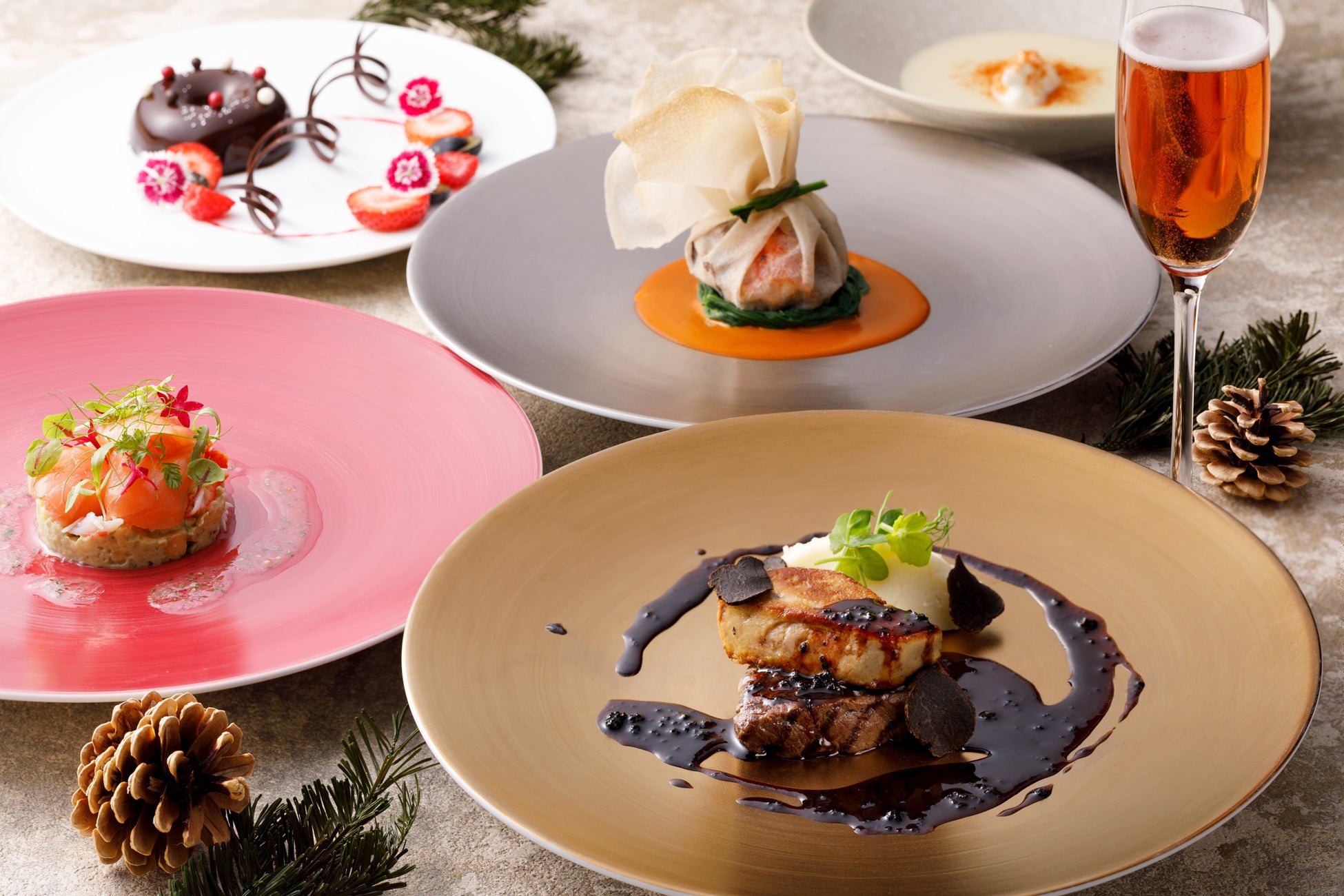 ランチでもクリスマス気分をお楽しみいただけるよう、2024年はクリスマスランチコースをご用意。九州の旬の食材の魅力を活かしながら、エレガントなコースに仕上げました。柑橘の風味が爽やかなサーモン・タラバ蟹・アボカドのタルタルを糸島産ハーブソースで楽しむ前菜からはじまり、サステナブルロブスターと肉厚な椎茸をサクサクのパートブリックで包んだ魚料理、トリュフソースで楽しむ博多和牛のグリル、リースをイメージしたチョコレートムースのデザートまで、ホリデーシーズンのランチタイムをゆったりとお楽しみください。